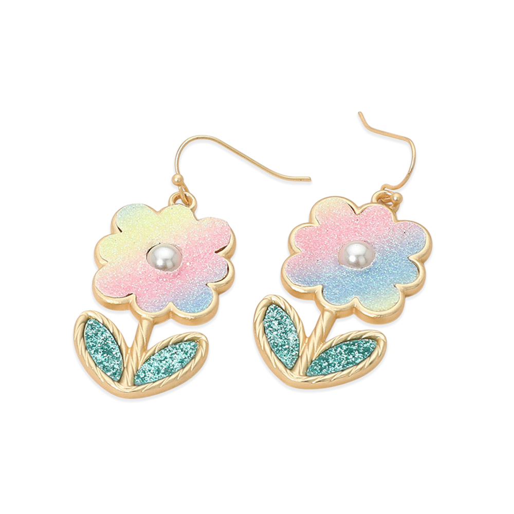 Pearl Accent Glitter Flower Charm Dangle Earrings