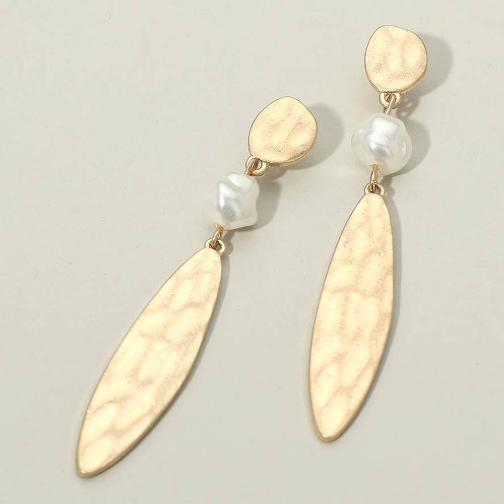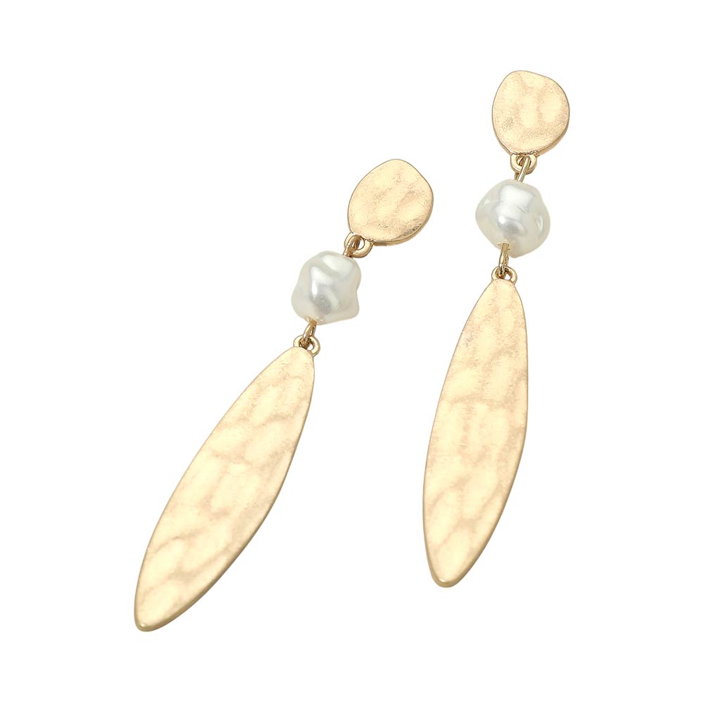 Details • Size : 0.5" X 3" • Post Back • Stylish drop earrings featuring a hammered finish paired with a soft pearl accent for added texture and movement. Designed to elevate everyday outfits and complement dressy looks, these earrings offer a balanced blend of modern shape and timeless charm, making them ideal for work, events, or special occasions. • Lead and Nickel Compliant