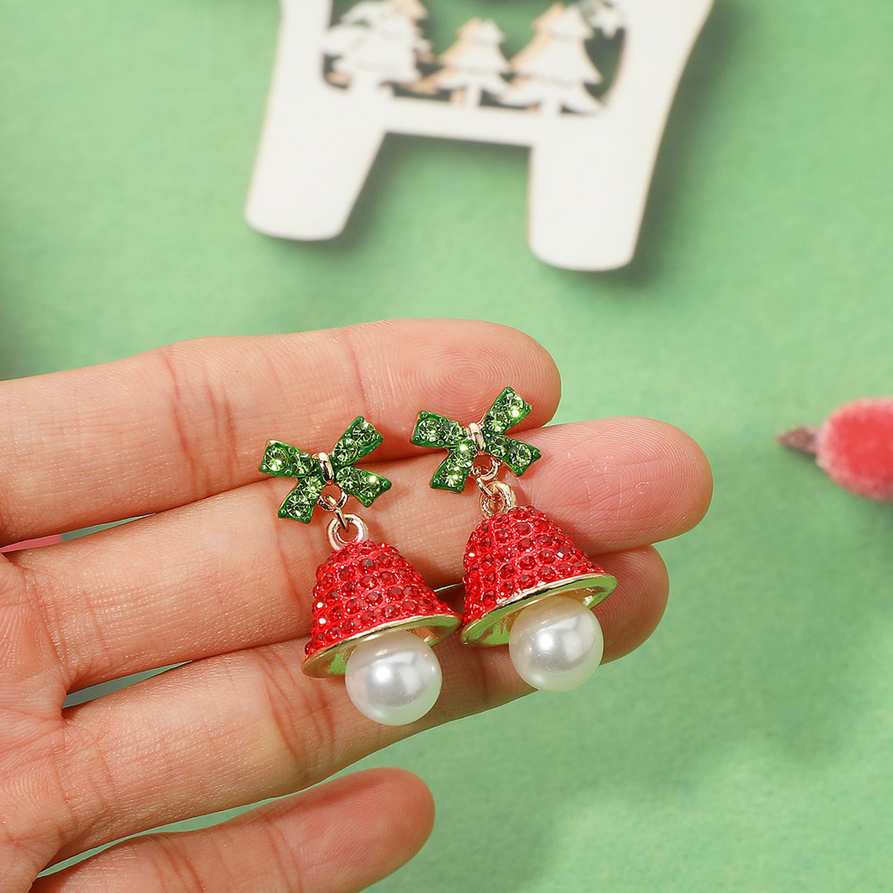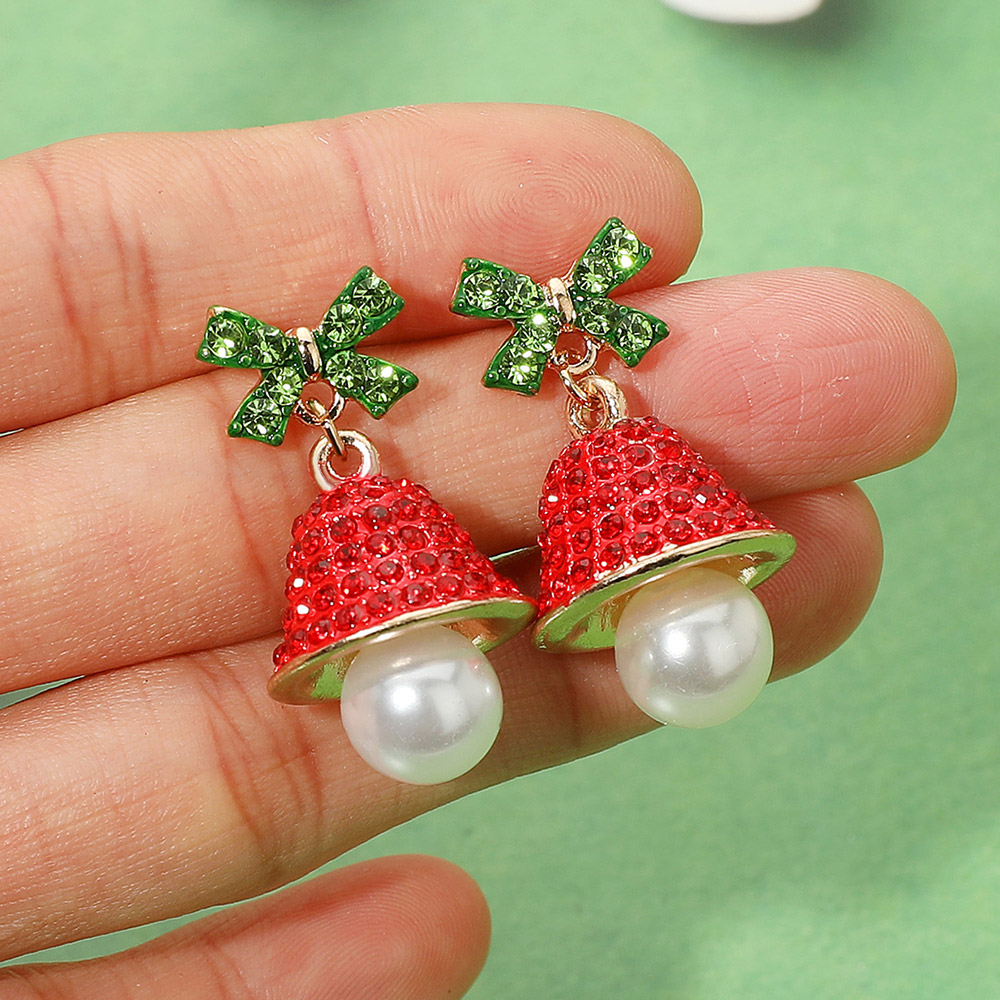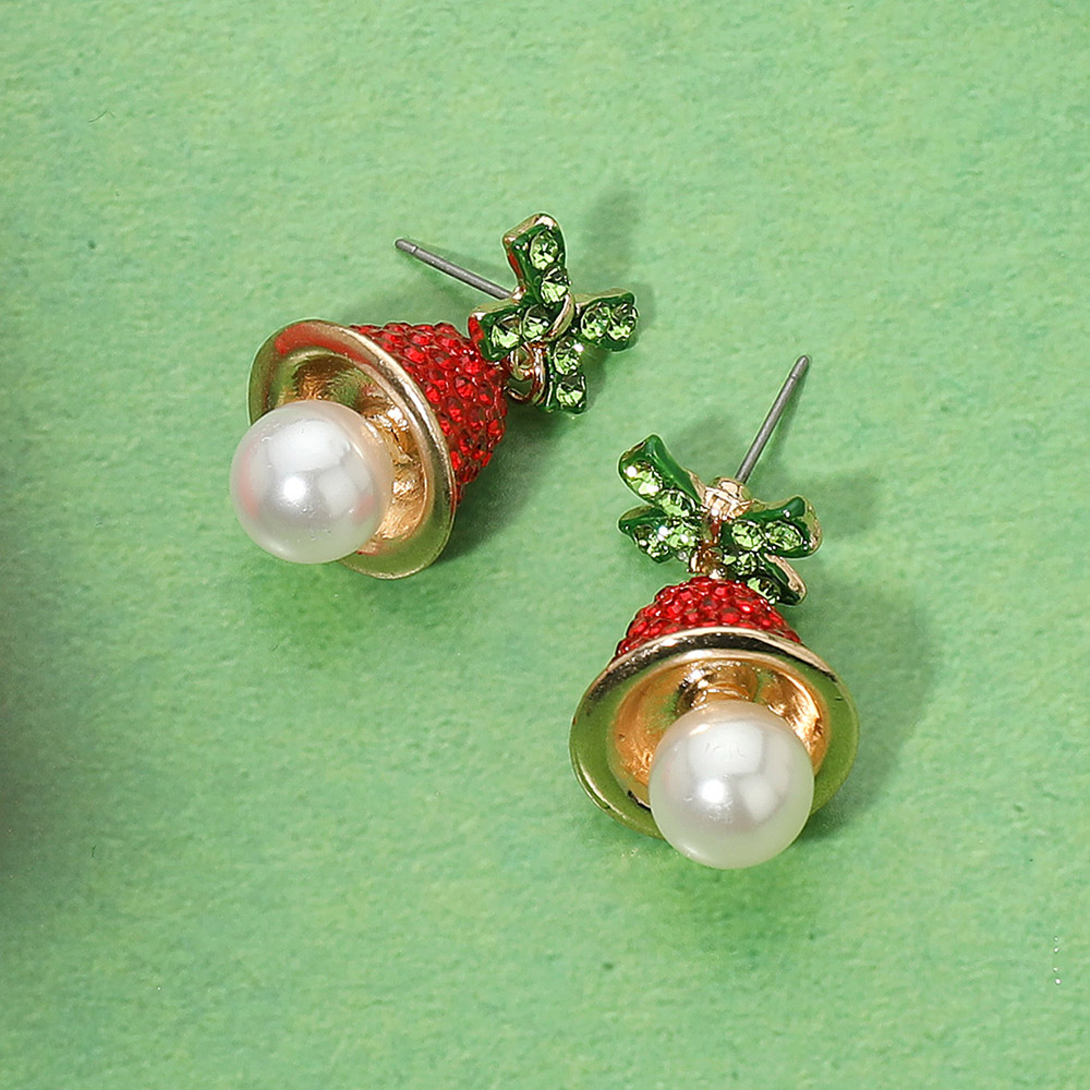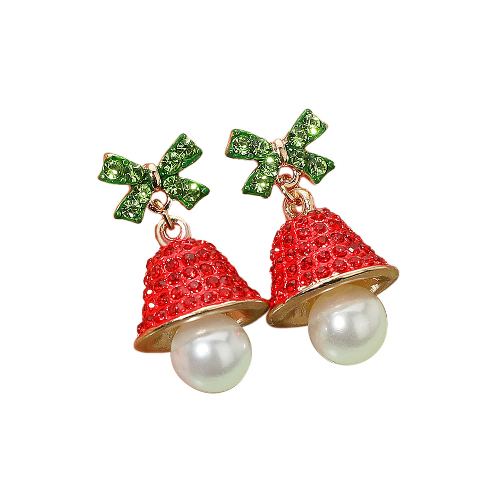 Details • Size : 0.7" X 1.3" • Post Back • Celebrate the season with these holiday bell earrings, featuring sparkling bow details and elegant pearl drops. Perfect for festive gatherings, Christmas parties, or as a charming gift, they bring playful holiday spirit and timeless style to your jewelry collection. • Lead and Nickel Compliant