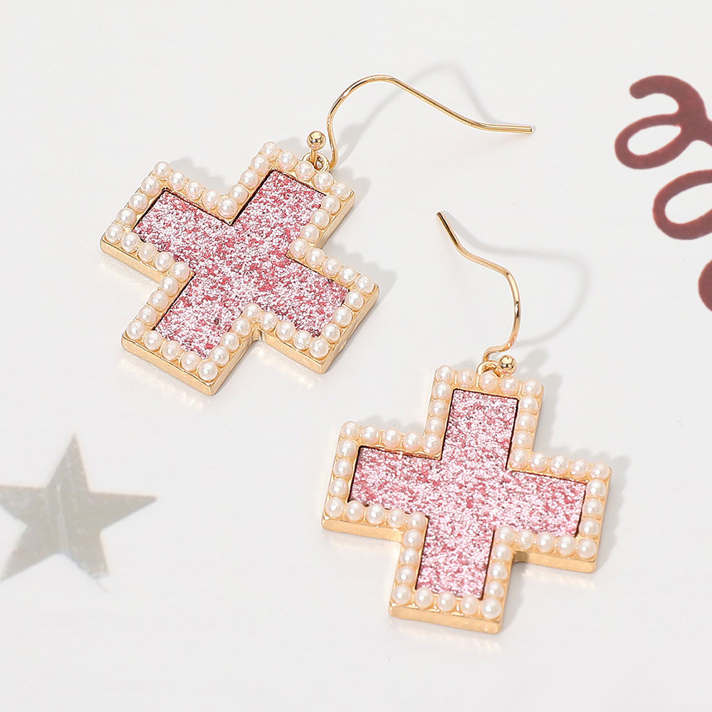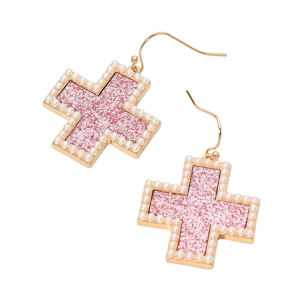 Pearl Edge Sparkle Cross Dangle Earrings Pearl Edge Sparkle Cross Dangle Earrings