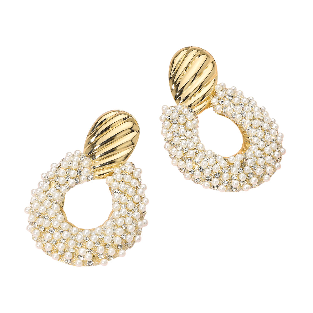 Details • Size : 1.5" X 2.25" • Post Back • These pearl encrusted sculptural hoop earrings feature a bold circular silhouette adorned with delicate beading for a timelessly elegant touch. The textured upper detail enhances their refined charm, making them a perfect choice for sophisticated occasions or statement daywear. • Lead and Nickel Compliant