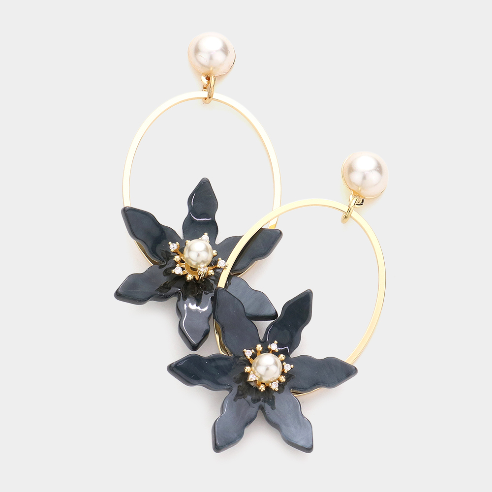 Pearl Pointed Resin Flower Accented Open Metal Oval Dangle Earrings