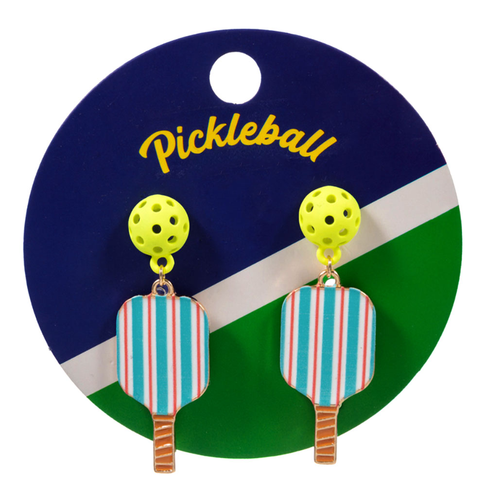 • These pickleball paddle drop earrings feature a playful ball accent and sporty paddle design that adds fun energy to any outfit. Lightweight and eye catching, they are ideal for game day looks, casual styling, gifting, or pickleball enthusiasts who want accessories that celebrate the sport with personality and charm.
