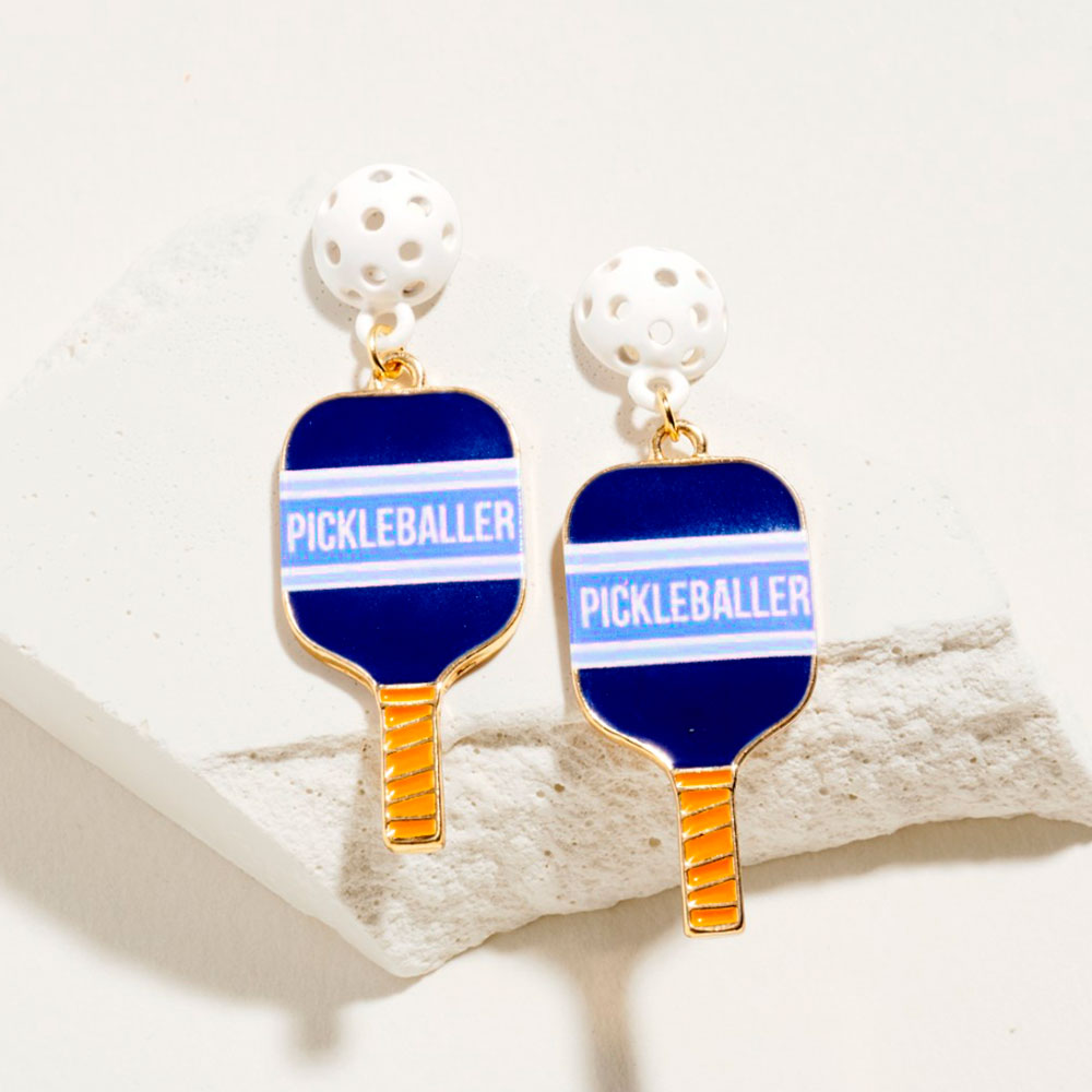 Details • Size : 0.7" X 1.75" • Post Back • These pickleball paddle drop earrings feature a playful ball accent and sporty paddle design that adds fun energy to any outfit. Lightweight and eye catching, they are ideal for game day looks, casual styling, gifting, or pickleball enthusiasts who want accessories that celebrate the sport with personality and charm. • Lead and Nickel Compliant