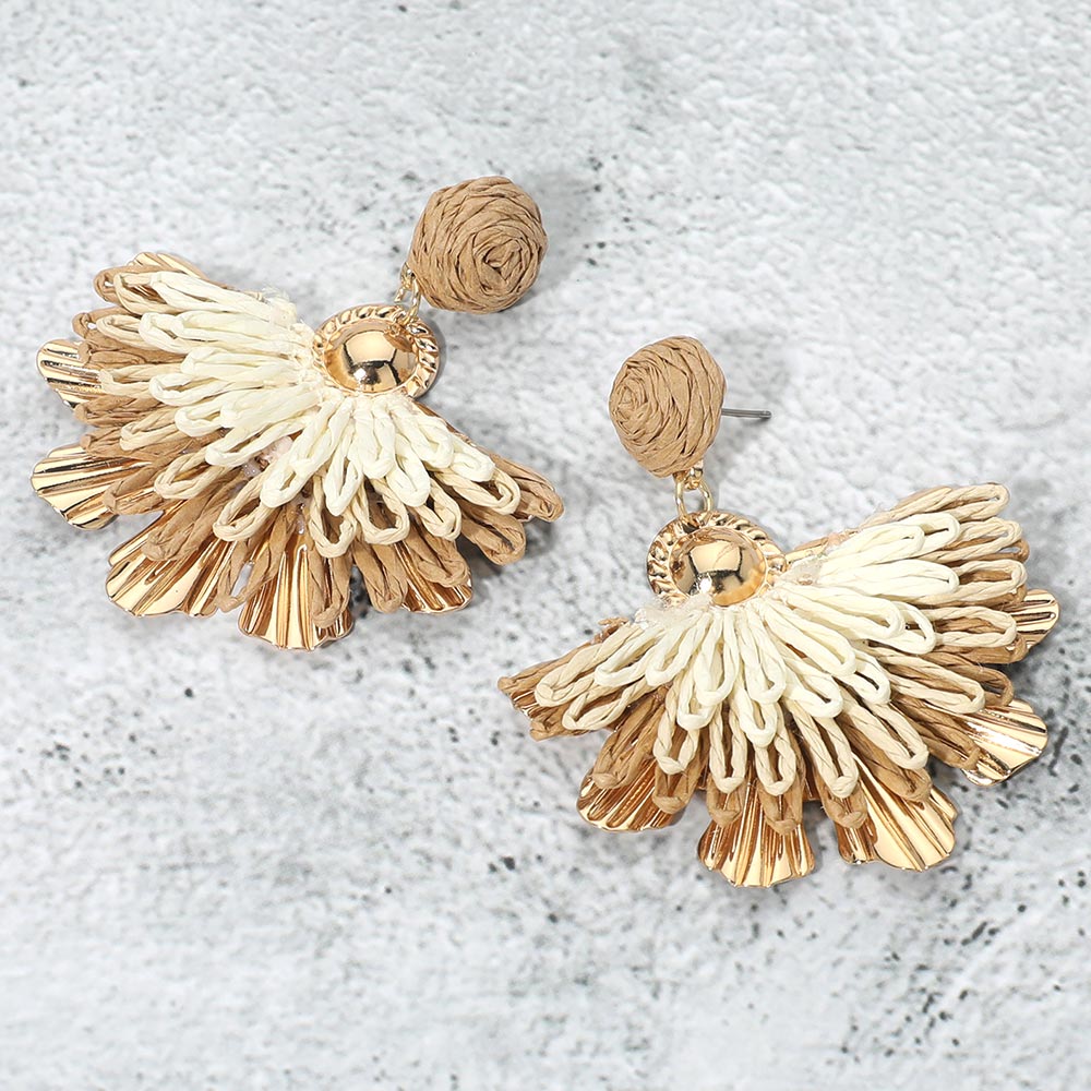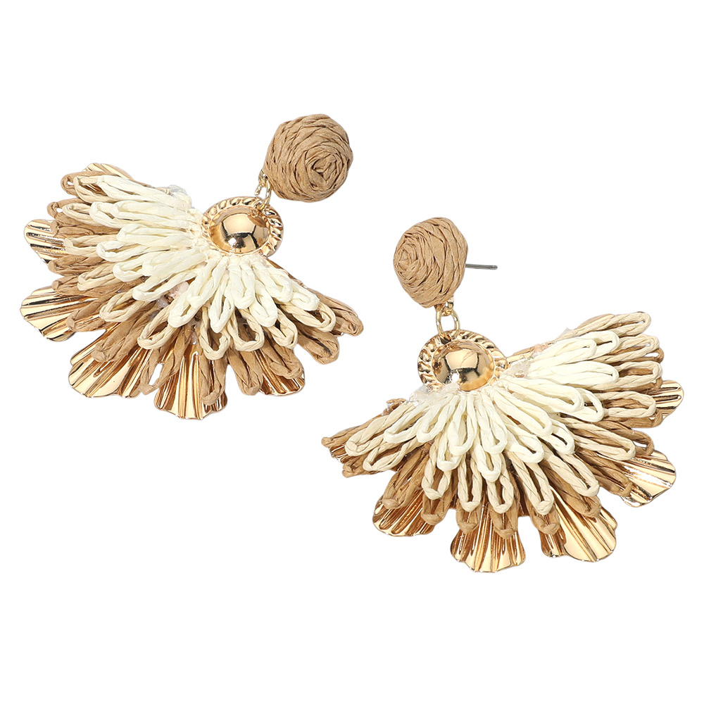 Details • Size : 2.25" X 2.6" • Post Back • These fan fringe statement drop earrings feature layered woven-inspired detailing and dramatic movement for eye-catching style. Designed to elevate boutique assortments, they add bold texture and dimension, making them ideal for resort looks, summer outfits, festivals, special occasions, and fashion-forward everyday accessorizing. • Lead and Nickel Compliant
