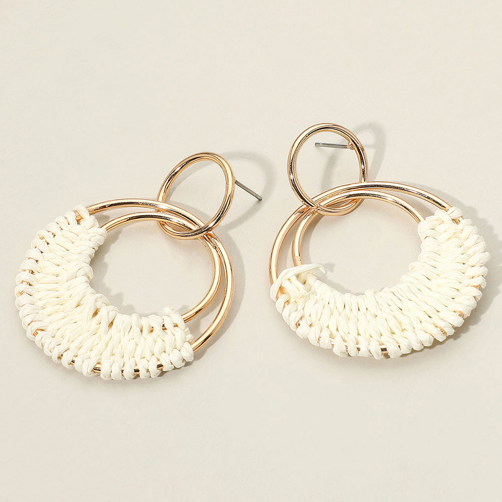 Details • Size : 1.5" X 2.5" • Post Back • Fun and stylish hoop earrings featuring woven thread accents and double gold rings. Lightweight and bold, perfect for summer outfits, casual wear, or adding flair to your everyday style. • Lead and Nickel Compliant