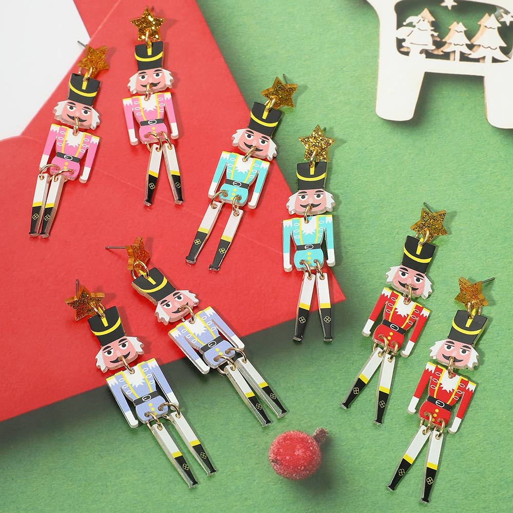 Details • Size : 0.7" X 3.2" • Post Back • Celebrate festive charm with these nutcracker soldier drop earrings featuring glittering star studs and playful detailing. Lightweight and eye-catching, they’re perfect for holiday parties, seasonal outfits, or adding whimsical fun to your jewelry collection with a touch of festive flair. • Lead and Nickel Compliant