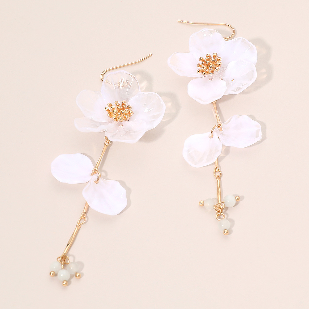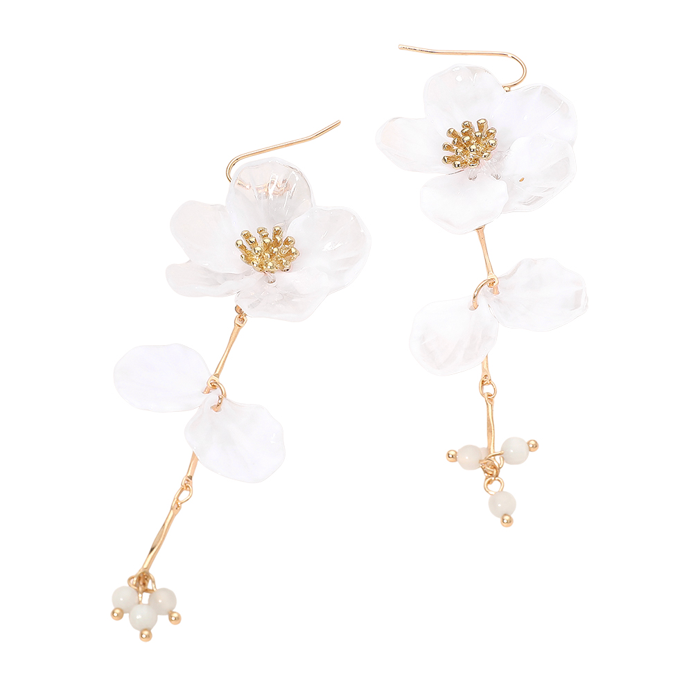 Details • Size : 1.25" X 3.75" • Fish Hook Back • Elegant long drop earrings featuring layered floral petals and delicate clustered accents for a soft, romantic look. Perfect for weddings, parties, garden events or adding graceful botanical charm to everyday style with their airy, feminine movement. • Lead and Nickel Compliant