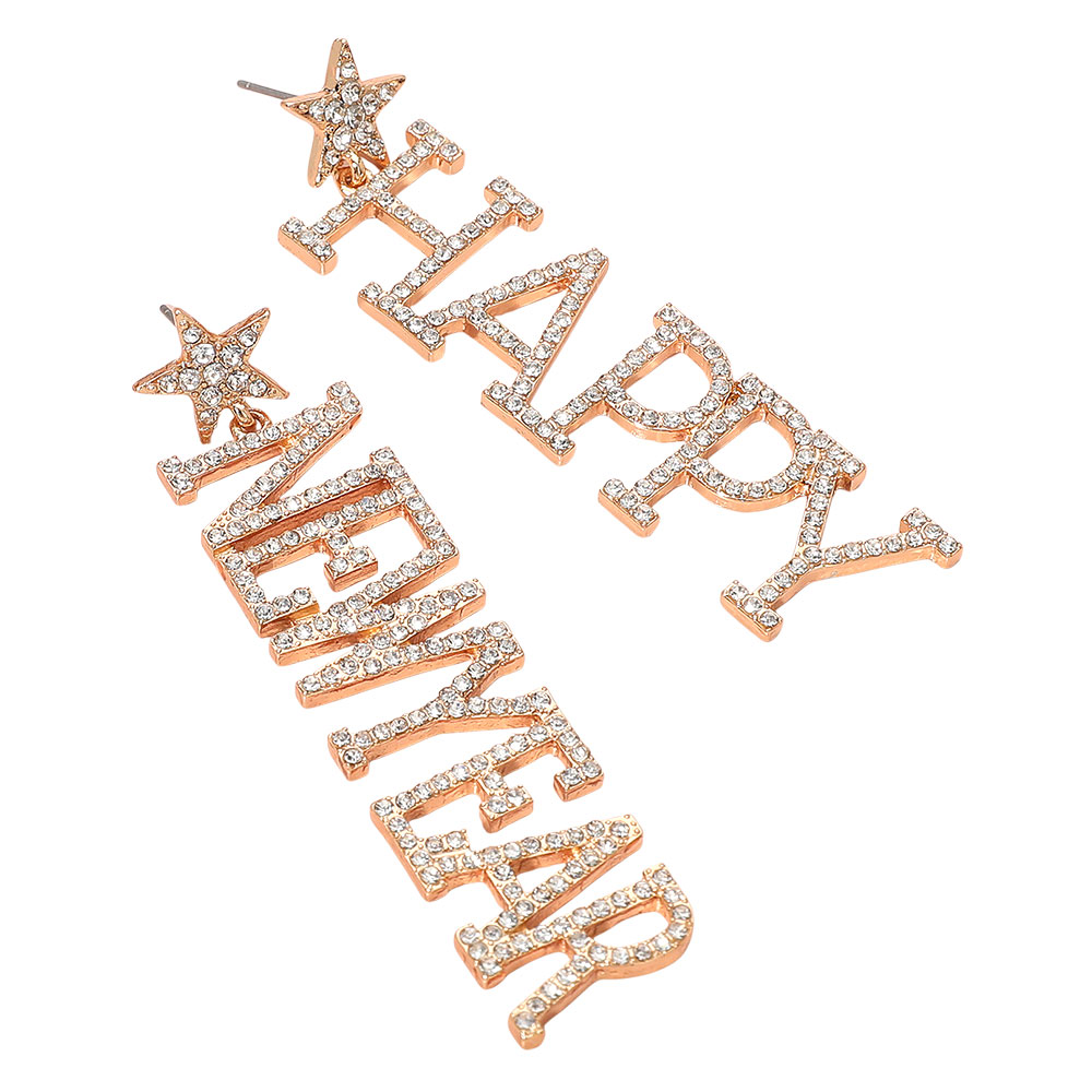 Details • Siez : 0.7" X 3" • Post Back • Celebrate in style with these dazzling Happy New Year statement earrings featuring sparkling letter accents and festive star details. Perfect for ringing in the new year with glam and confidence, these earrings add radiant shine to your party look all night long. • Lead and Nickel Compliant