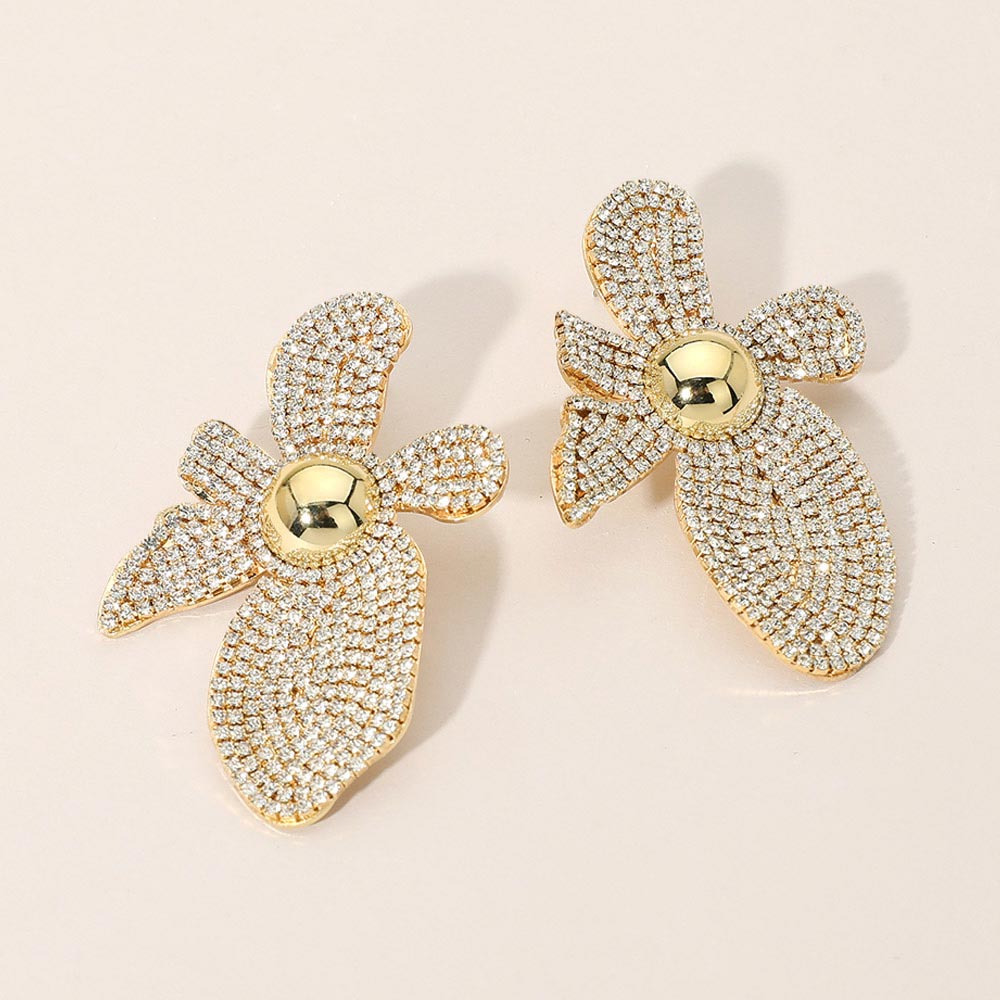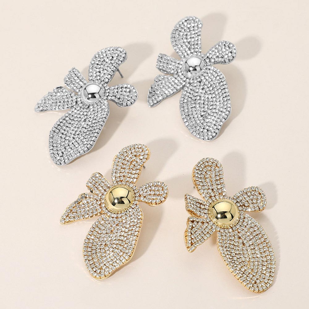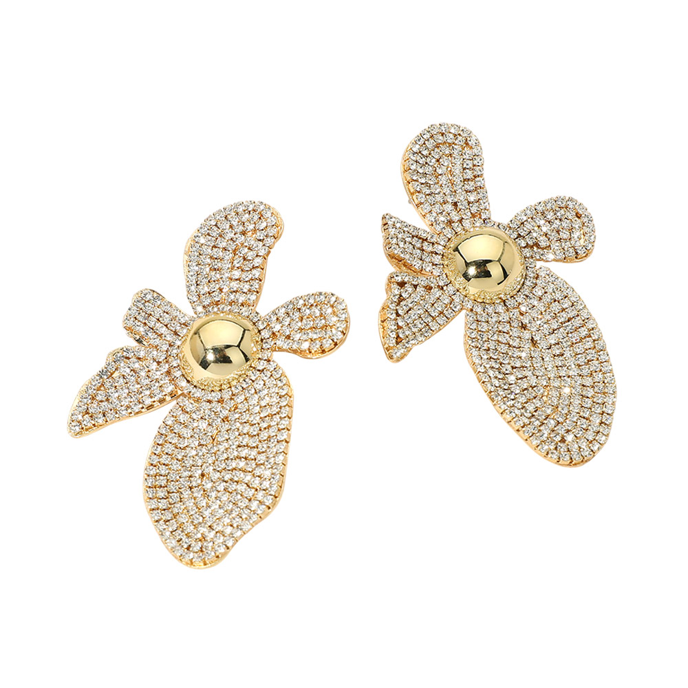 • PavĂ© flower statement earrings featuring layered petal shapes and a sculptural silhouette for high-impact styling. Designed to catch light from every angle, this bold yet refined accessory elevates evening looks, special events, and boutique jewelry assortments with timeless glamour and standout appeal.