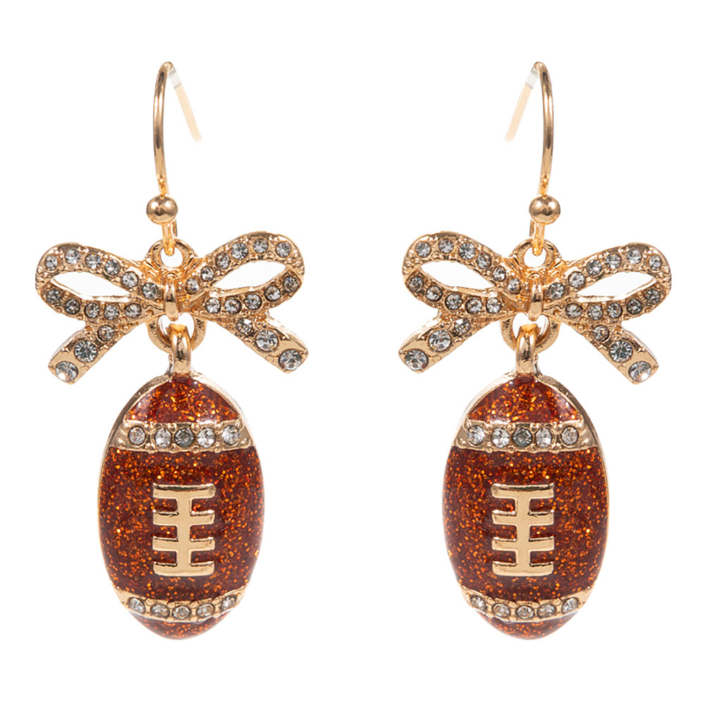 Details • Size : 0.7" X 1.3" • Brass Fish Hook Back • These Bow and Football Charm Dangle Earrings feature sparkling rhinestone details and playful bow designs. Perfect for sports lovers and stylish fans, they blend fun and elegance, making them ideal for game days, themed parties, or everyday fashion with a sporty twist. • Hypoallergenic • Lead and Nickel Compliant