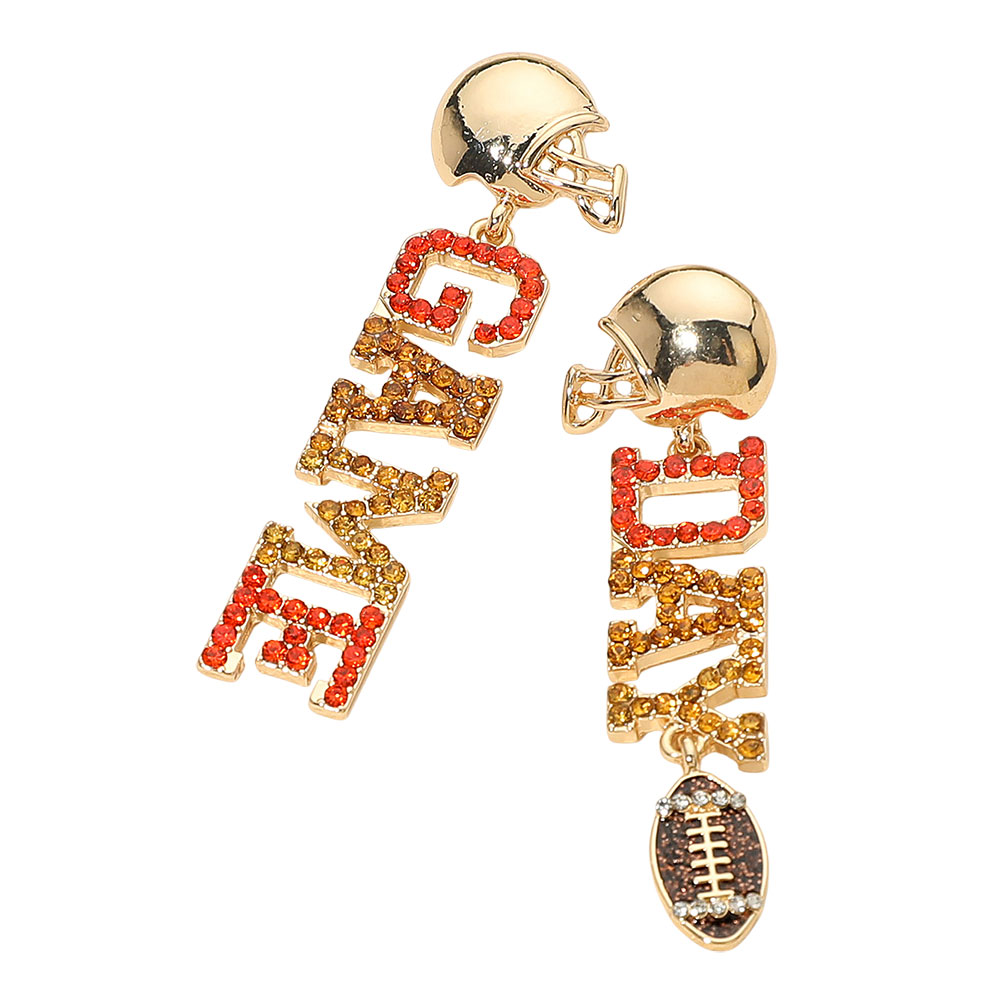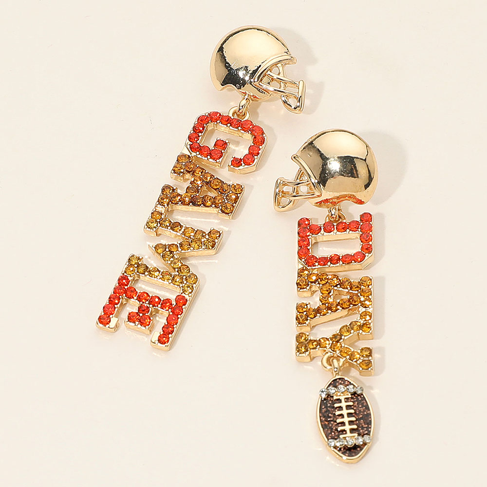 Details • Size : 0.7" X 2.4" • Post Back • Get ready to cheer in style with these Game Day helmet drop earrings. Featuring sparkling crystal letters, football accents, and bold sports flair, they add the perfect touch of excitement and team spirit to your game-day outfit or celebratory look. • Lead and Nickel Compliant