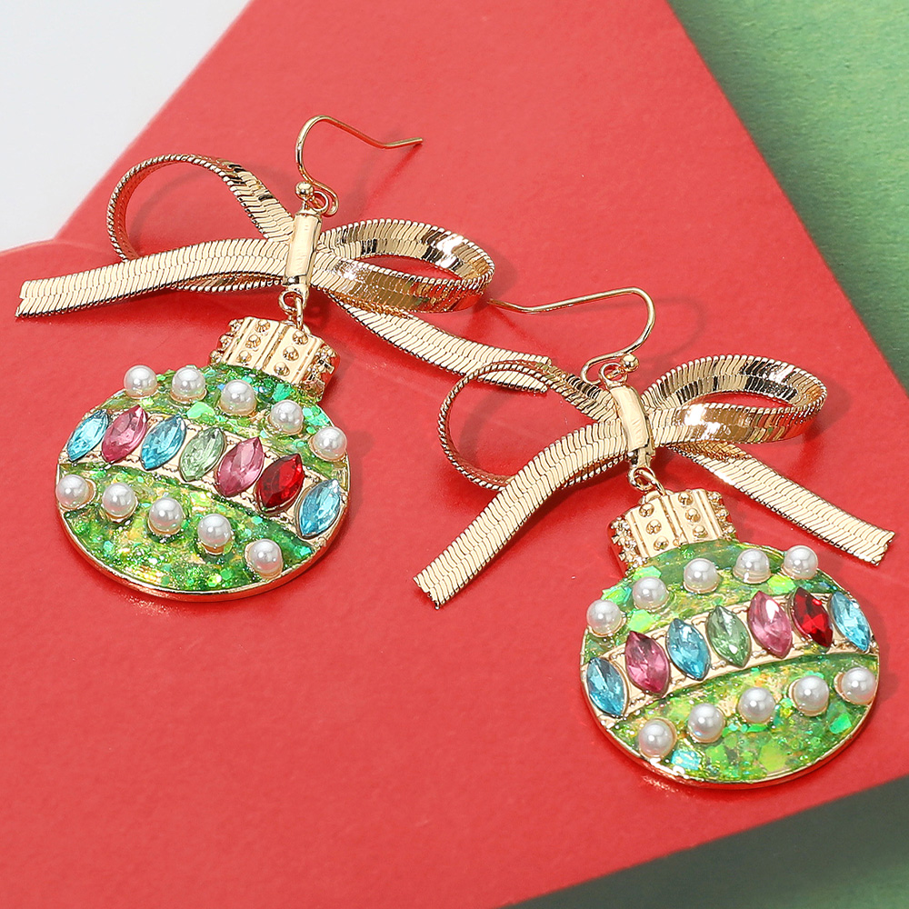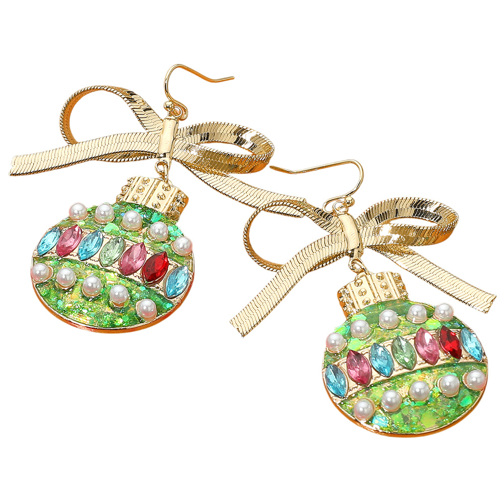 Details • Size : 1.6" X 2.3' • Fish Hook Back • Celebrate the season in style with these festive ornament drop earrings featuring colorful gemstones, pearl accents, and elegant gold-tone bows. Perfect for holiday parties, gatherings, or gifting, these cheerful earrings add sparkle and festive charm to any outfit. • Lead and Nickel Compliant