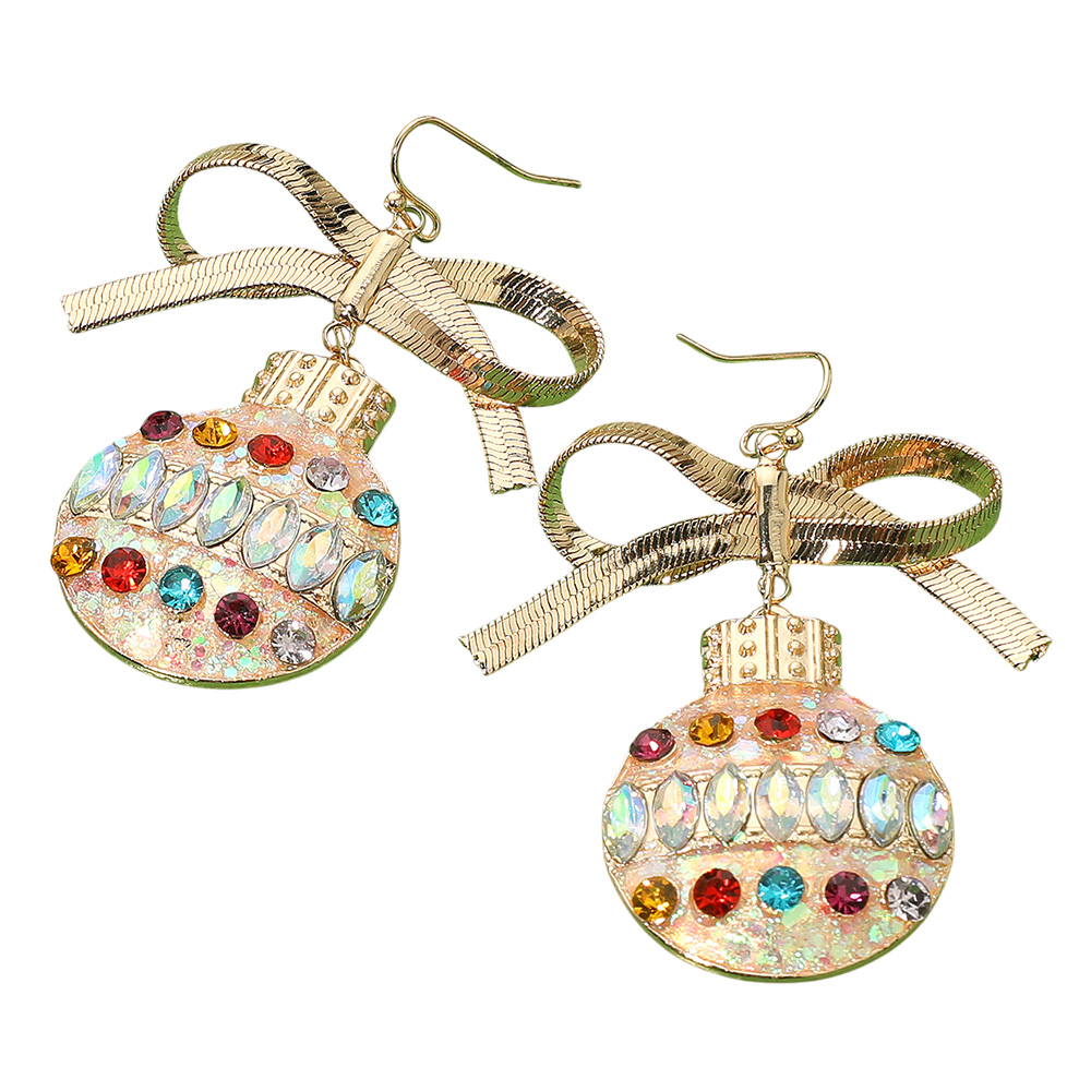 Details • Size : 1.6" X 2.3' • Fish Hook Back • Celebrate the season in style with these festive ornament drop earrings featuring colorful gemstones, pearl accents, and elegant gold-tone bows. Perfect for holiday parties, gatherings, or gifting, these cheerful earrings add sparkle and festive charm to any outfit. • Lead and Nickel Compliant