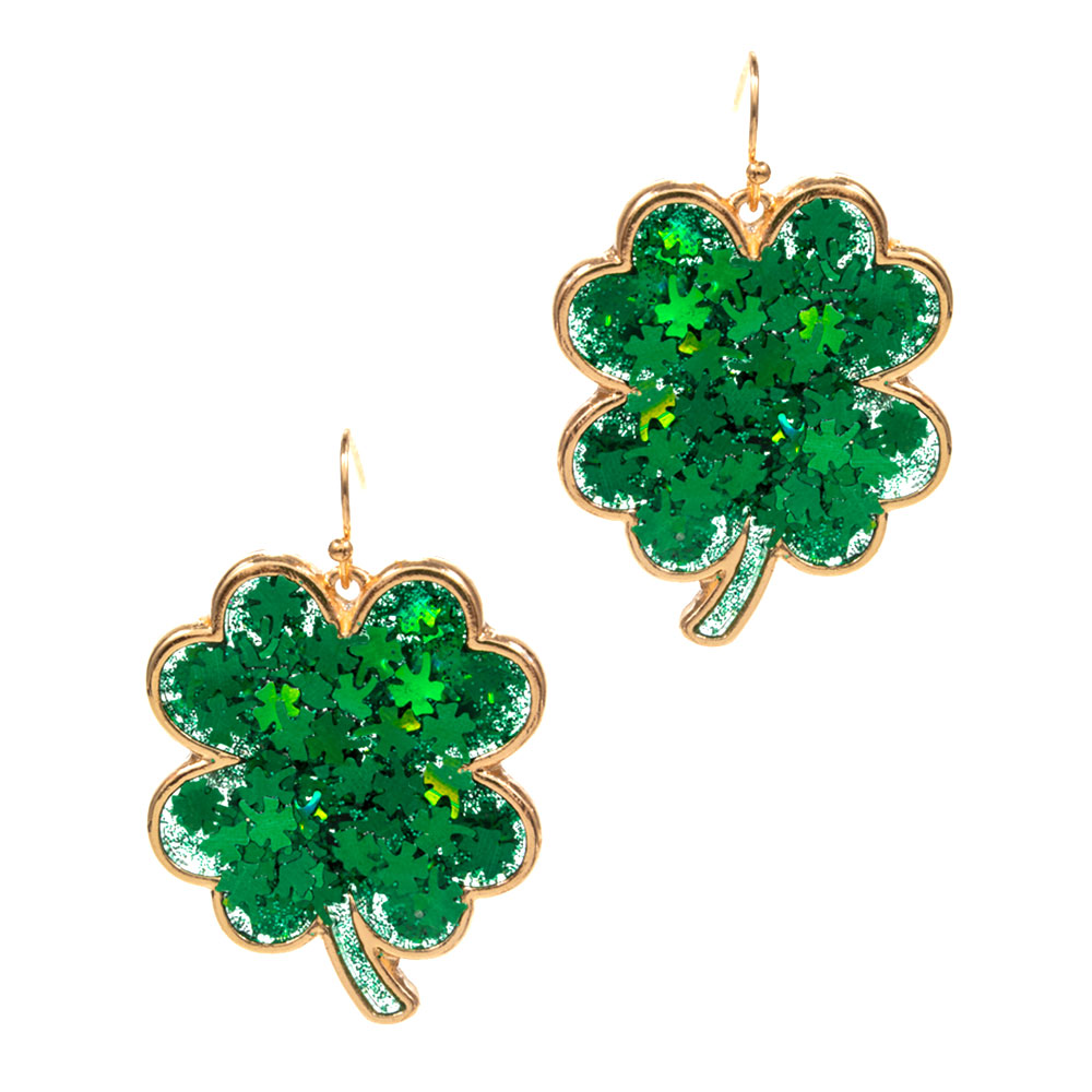 Details • Size : 1.25" X 1.6" • Brass Hook Back • Festive drop earrings designed with a shamrock silhouette and sparkling textured finish for eye-catching appeal. Perfect for seasonal celebrations, themed events, and party displays, this lightweight statement style adds playful charm, movement, and standout personality to any accessory assortment. • Hypoallergenic • Lead and Nickel Compliant
