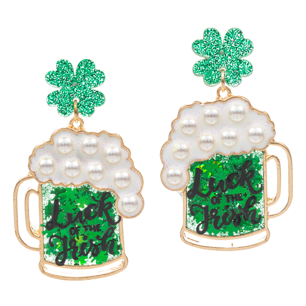 Details • Size : 1.3" X 2.8" • Titanium Post Back • These festive drop earrings feature a playful beer mug design with shamrock accents and a fun “Luck of the Irish” message for a bold seasonal statement. Lightweight with eye-catching movement, they are perfect for St. Patrick’s Day celebrations, themed parties, gifting, or adding cheerful personality to holiday outfits and novelty jewelry collections. • Hypoallergenic • Lead and Nickel Compliant