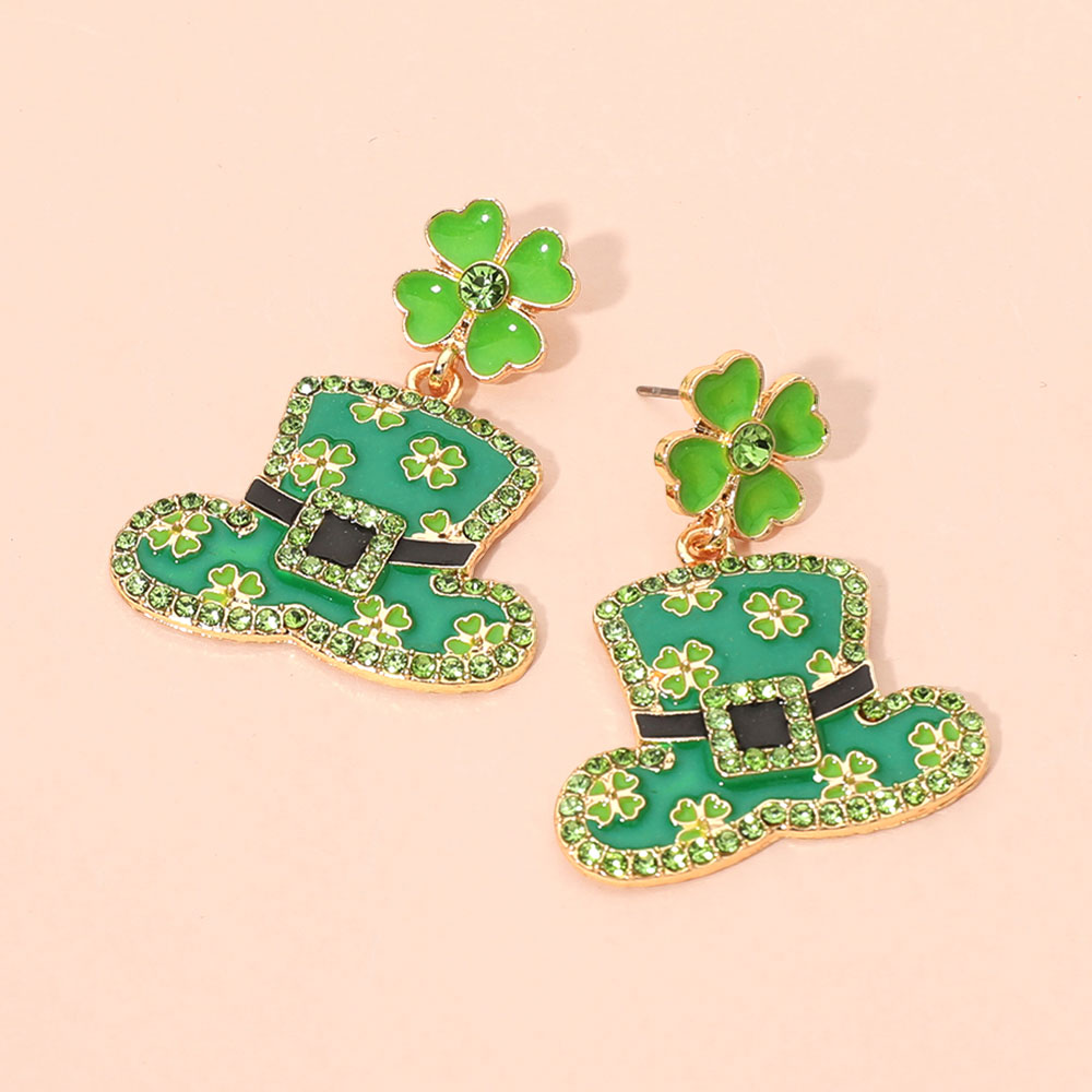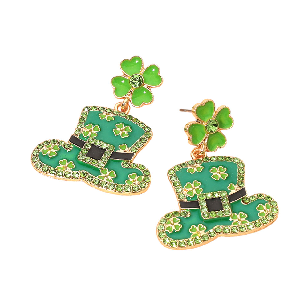 Details • Size : 1.25" X 1.5" • Post Back • Festive clover hat drop earrings designed to bring playful charm and seasonal appeal to any accessory collection. Featuring detailed accents and a fun dangling silhouette, these statement earrings are perfect for holiday events, themed outfits, and eye-catching boutique displays that celebrate luck and cheerful style. • Lead and Nickel Compliant