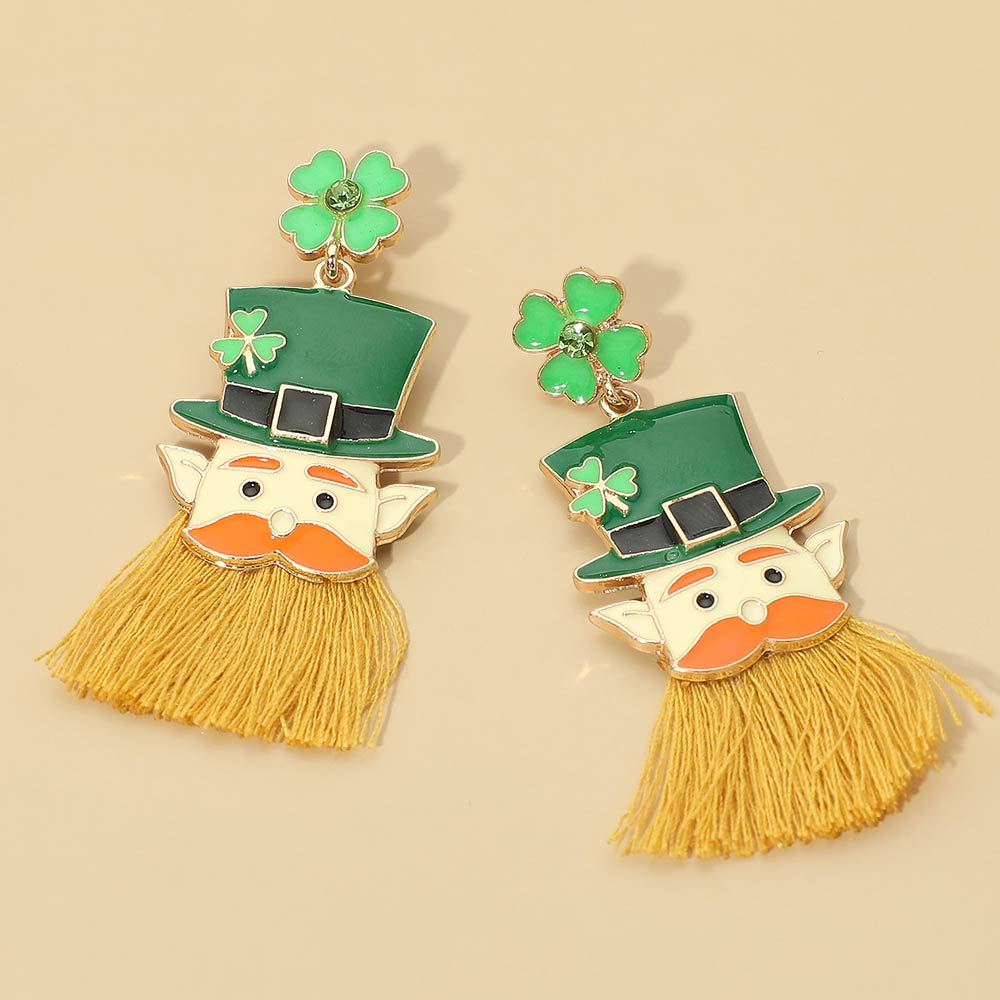 Details • Size : 1.1" X 2.5" • Post Back • Festive leprechaun clover tassel drop earrings designed to stand out with playful character details and eye-catching movement. A fun statement accessory for seasonal celebrations, themed outfits, party styling, and gift selections, offering lightweight comfort with bold personality for all-day wear. • Lead and Nickel Compliant