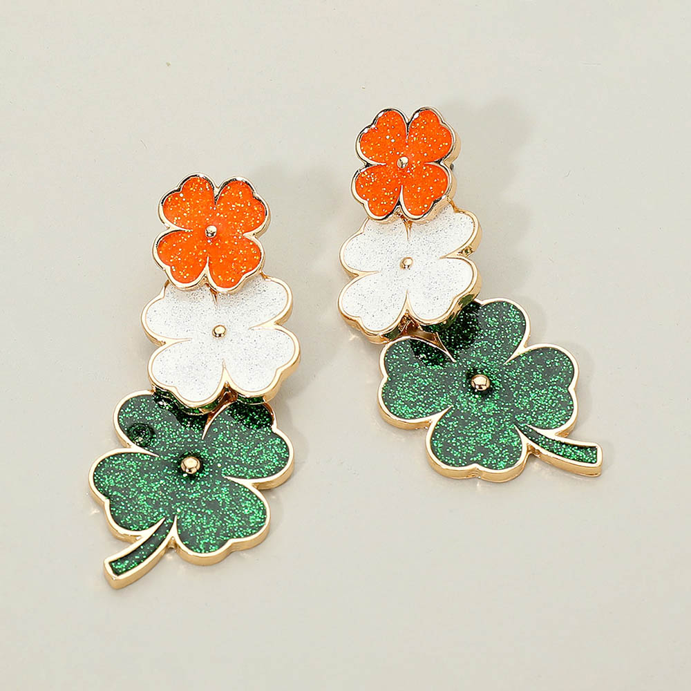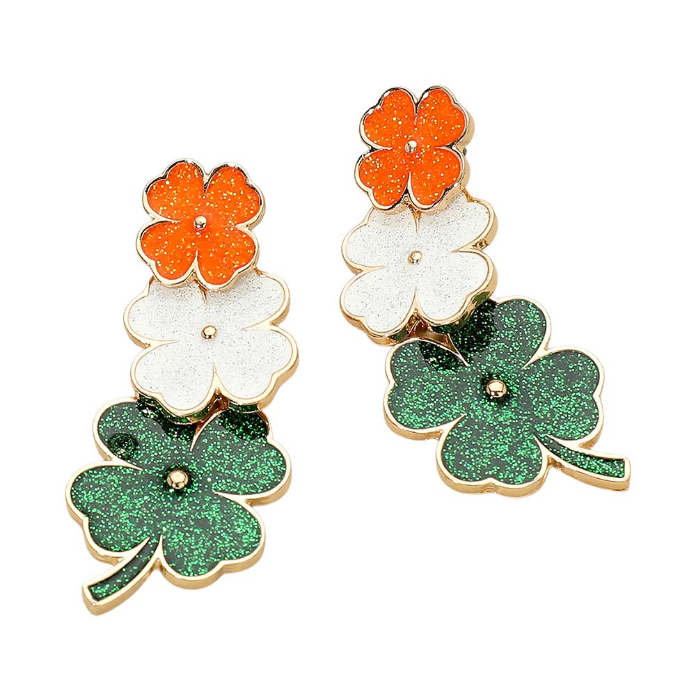Details • Size : 0.9" X 2.25" • Post Back • Festive clover drop earrings designed for St. Patrick’s Day celebrations, featuring layered shamrock accents with eye-catching sparkle and playful movement. A bold seasonal accessory perfect for parades, parties, themed outfits, gifting, and holiday retail displays that attract attention and boost festive appeal. • Lead and Nickel Compliant
