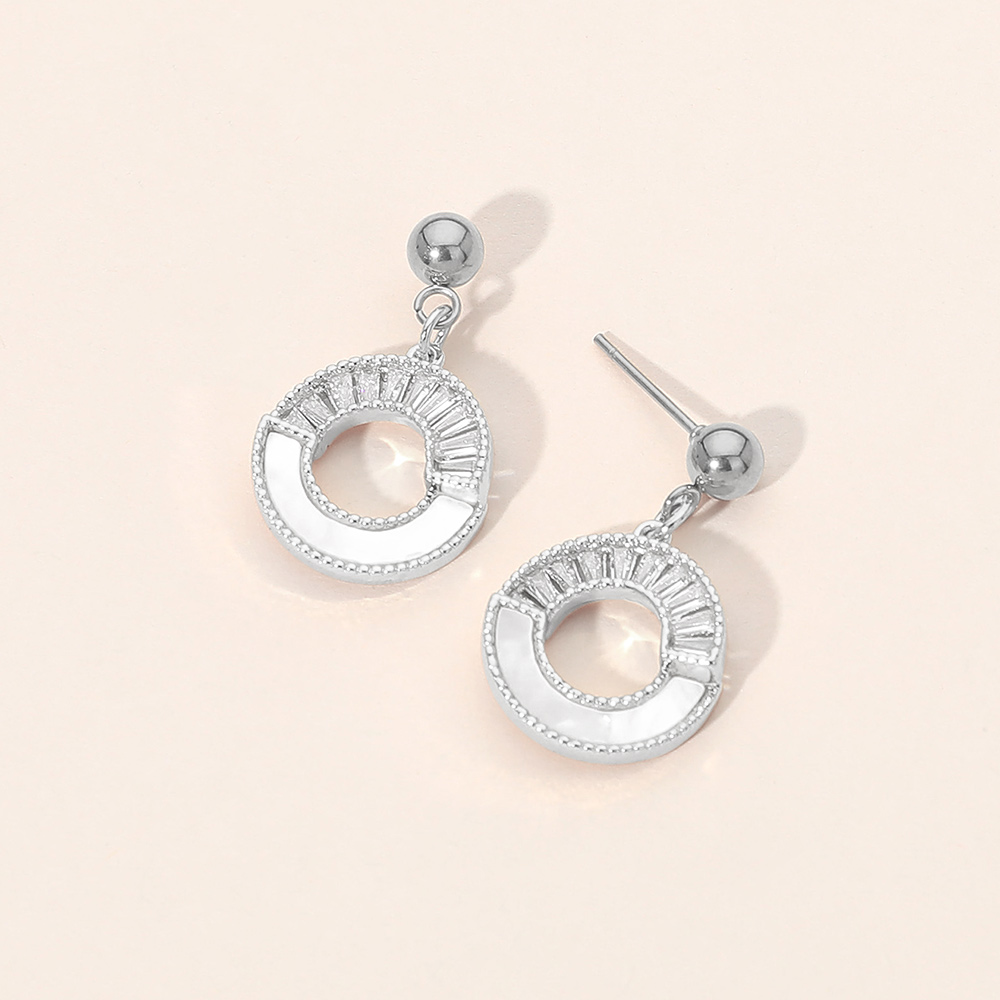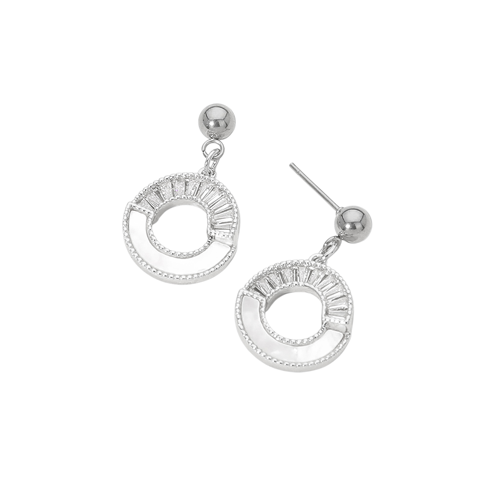 Stainless Steel CZ Pave Mother of Pearl Detail Open Circle Charm Dangle Earrings Stainless Steel CZ Pave Mother of Pearl Detail Open Circle Charm Dangle Earrings