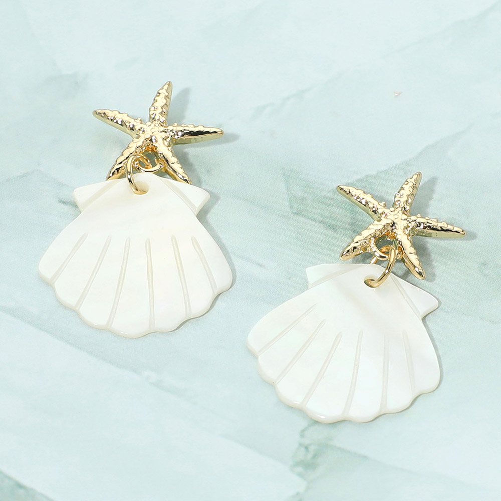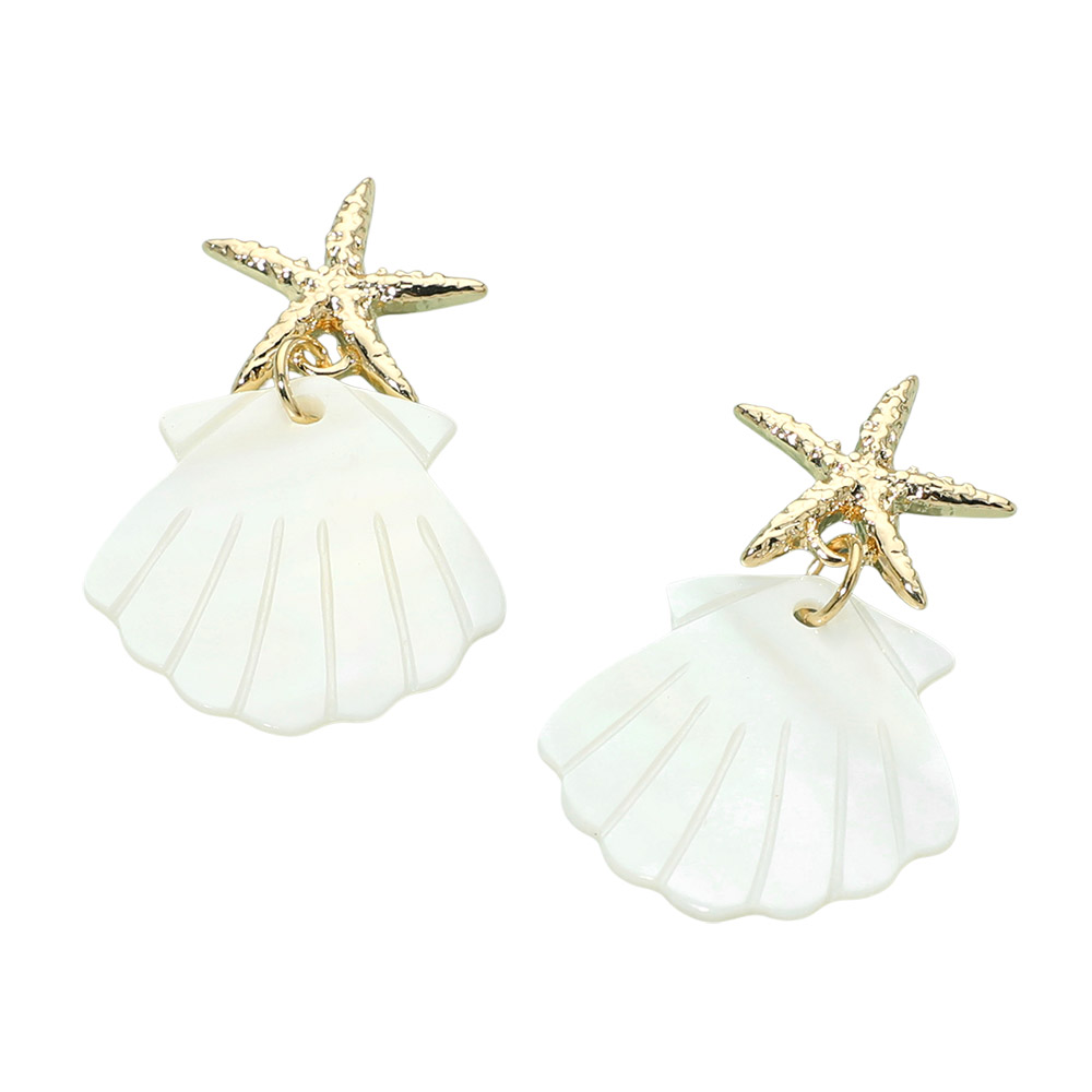 Details • Size : 1" X 1.5" • Post Back • Charming drop earrings featuring a starfish accent paired with a shell-inspired design for a breezy coastal aesthetic. Lightweight and eye-catching, this style adds playful movement and vacation-ready appeal to everyday outfits. A great choice for beach-themed collections, summer assortments, and giftable accessories that attract trend-focused shoppers. • Lead and Nickel Compliant