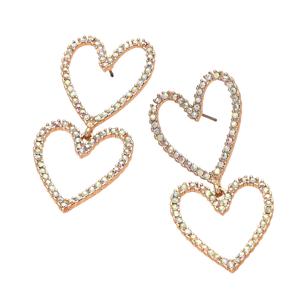 Details • Size : 1" X 2.25" • Post Back • Shine bright with these dazzling double heart drop earrings featuring sparkling rhinestone accents. Their elegant intertwined heart design adds romantic flair and playful sparkle, making them the perfect statement accessory for parties, dates, or special celebrations. • Lead and Nickel Compliant