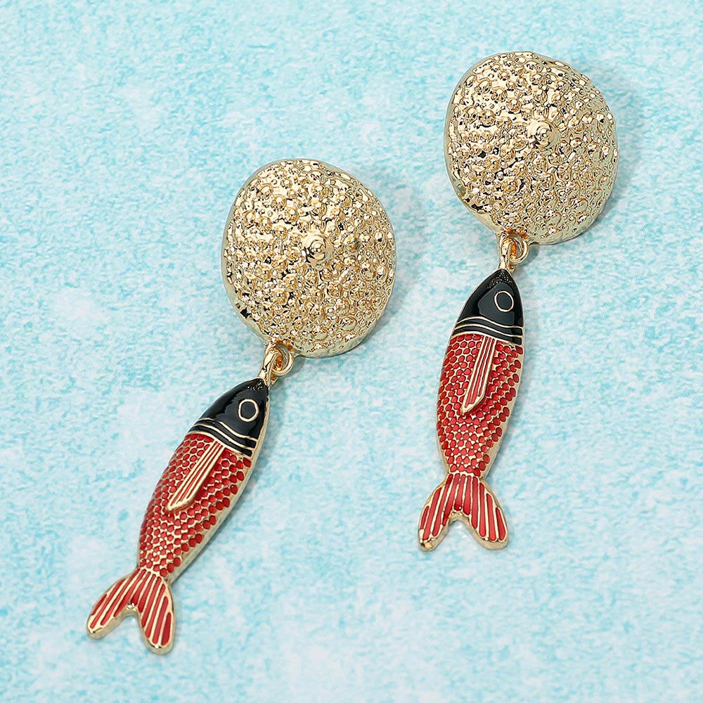 Textured Disc Enamel Fish Dangle Drop Statement Earrings