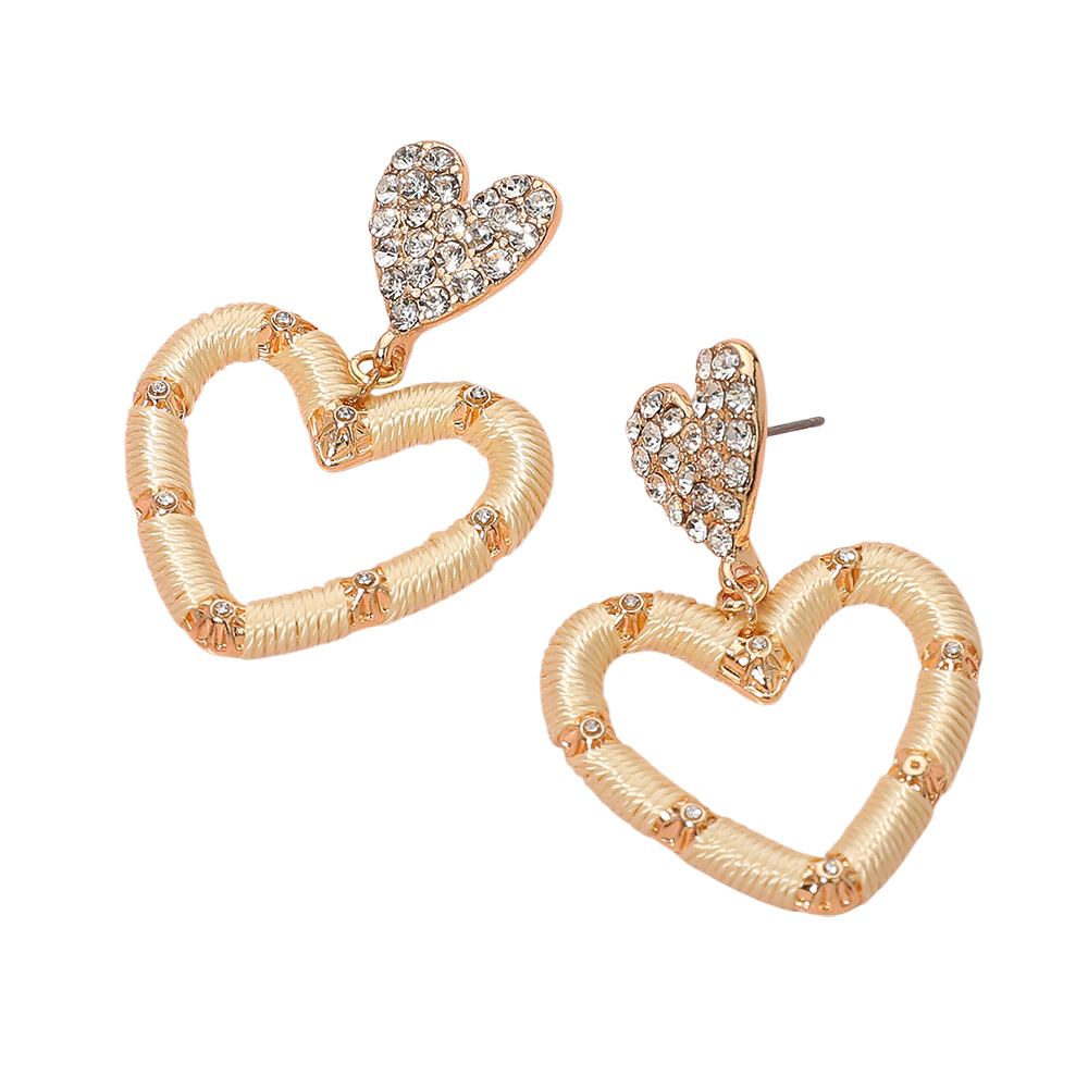 • Elegant heart-shaped drop earrings featuring a textured open frame and a sparkling stone-studded heart topper. A charming statement accessory designed to add sparkle and feminine detail to everyday looks, celebrations, or special occasions.