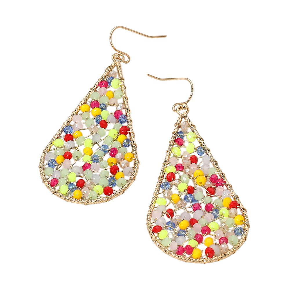 Details • Size : 1.25" X 2.75" • Fish Hook Back • Make a bold statement with these teardrop beaded earrings, featuring a vibrant mix of beads set in an artistic wire design. Lightweight and eye-catching, they bring a playful yet chic flair to any outfit, perfect for casual looks, parties, or festival-inspired style. • Lead and Nickel Compliant