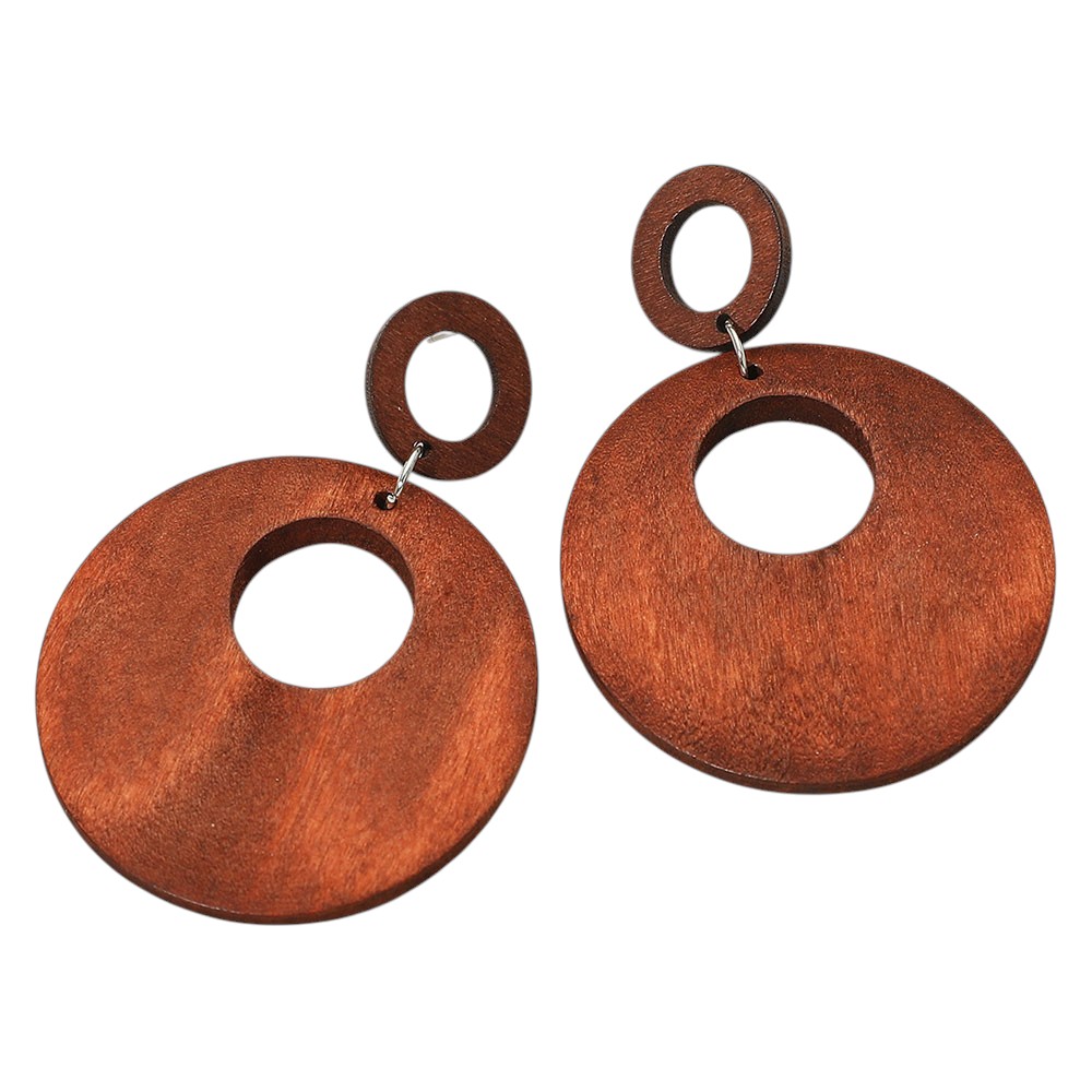 Details • Size : 1.9" X 2.7" • Post Back • Lightweight round cutout wooden drop earrings featuring a double circle silhouette, offering a bold statement look perfect for casual outfits, gifting, or adding natural style to any collection • Lead and Nickel Compliant