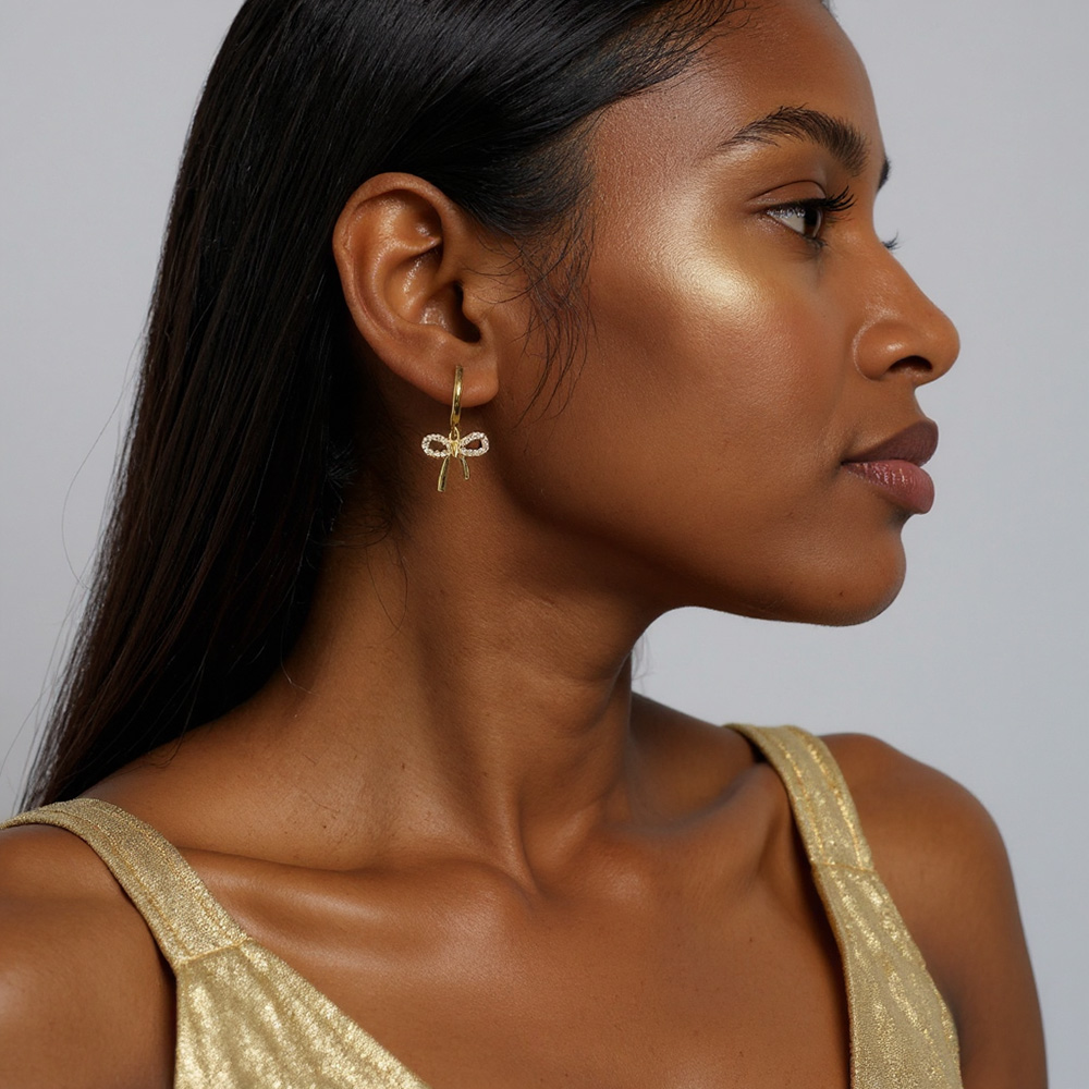 • These dainty hoop earrings feature sparkling CZ-studded bow charms that add a playful, feminine touch. Perfect for day-to-night wear, their chic design blends timeless elegance with whimsical detail, making them a versatile statement in any jewelry collection.