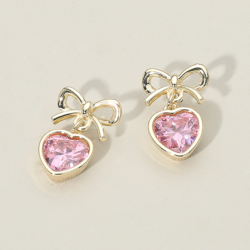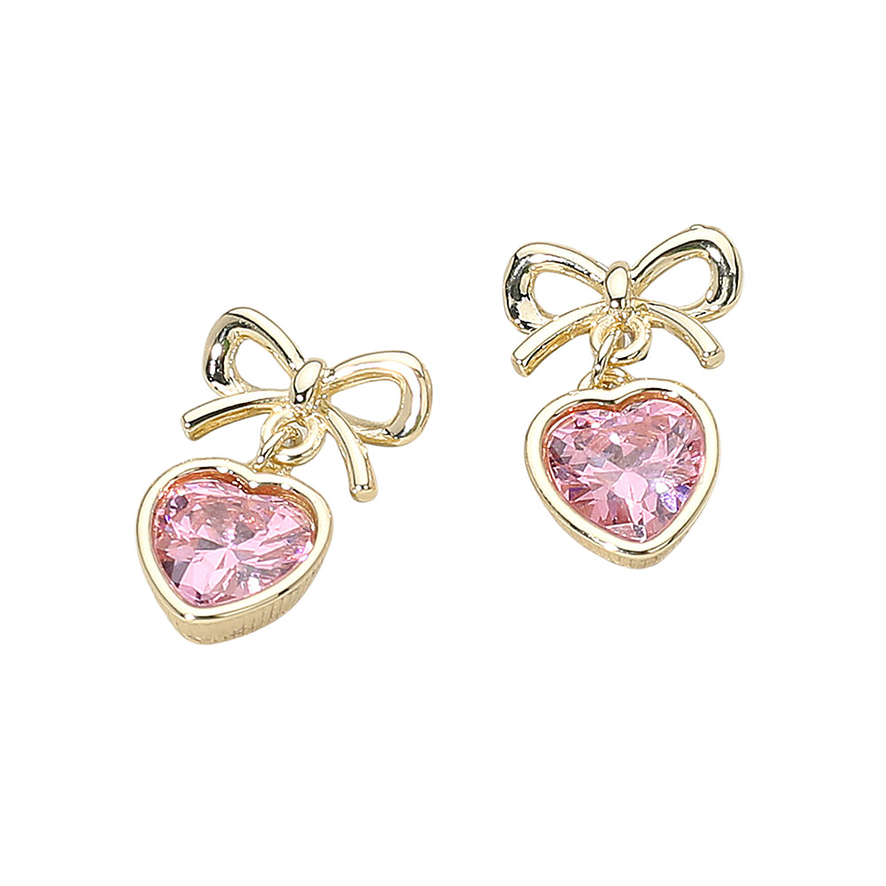 Details • Size : 0.7" X 1.1" • Post Back • Charming drop earrings featuring delicate bow tops paired with heart-shaped gemstone accents for a sweet, romantic look. Lightweight and stylish, they add a touch of sparkle to everyday outfits or special occasions. A perfect accessory for gifting or enhancing your jewelry collection. • CZ Cubic Zirconia • Gold Dipped