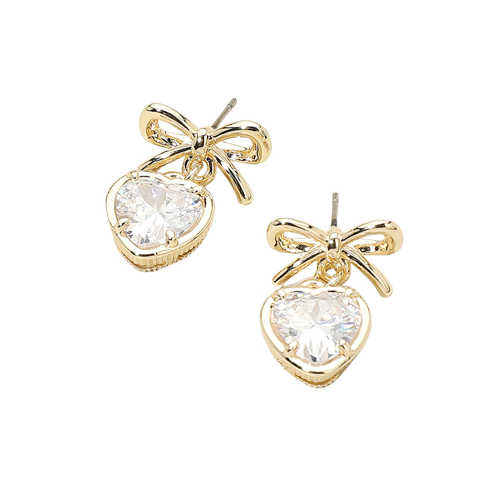Details • Size : 0.7" X 1.1" • Post Back • Charming drop earrings featuring delicate bow tops paired with heart-shaped gemstone accents for a sweet, romantic look. Lightweight and stylish, they add a touch of sparkle to everyday outfits or special occasions. A perfect accessory for gifting or enhancing your jewelry collection. • Gold Dipped • CZ Cubic Zirconia