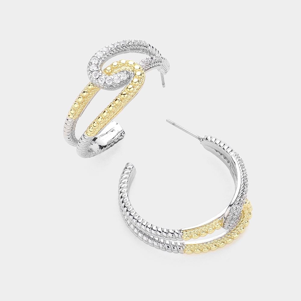 Two Tone CZ Stone Paved Crisscross Accent Textured Ring
