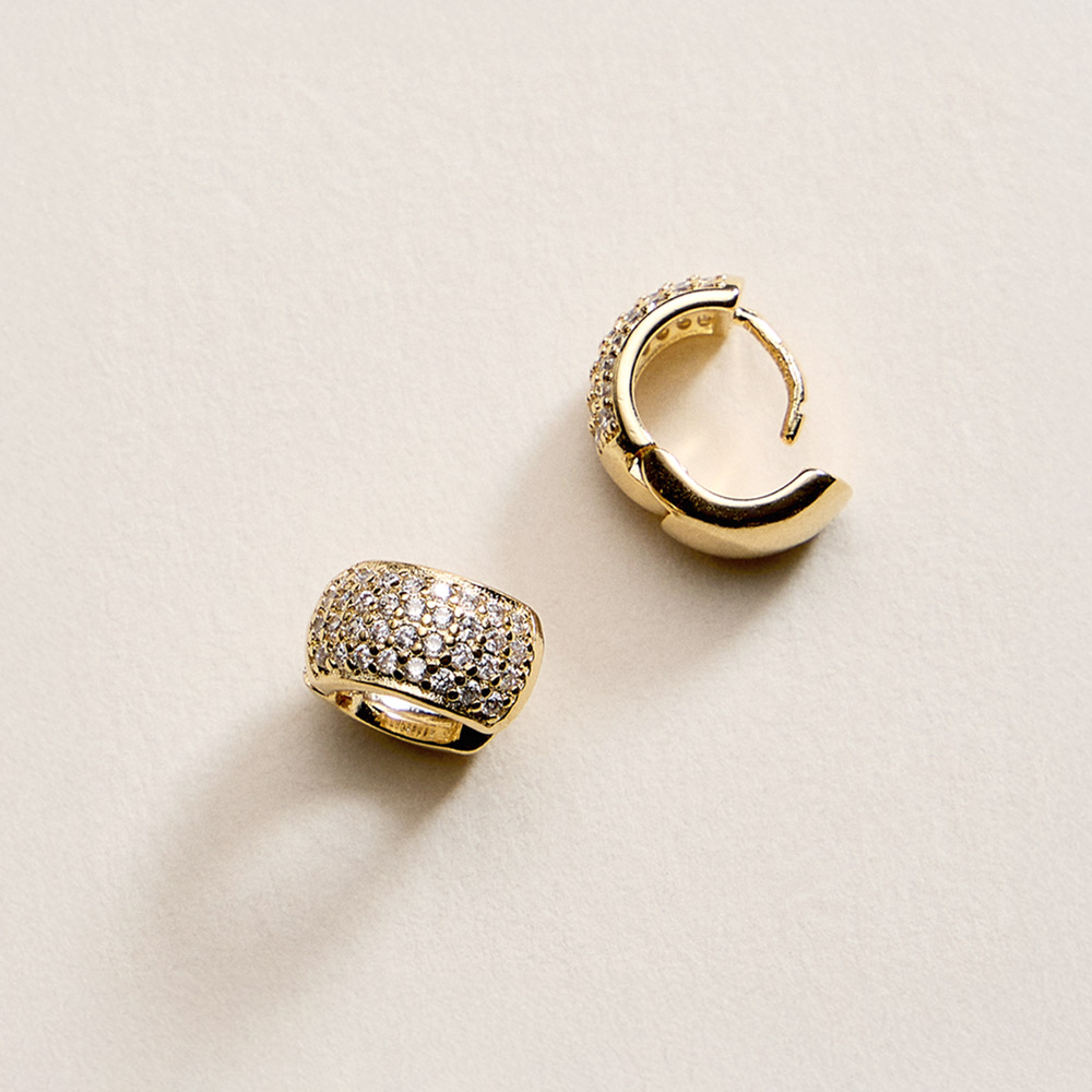 • Delicate mini huggie clip earrings designed with a rounded silhouette and pavĂ© style detailing for subtle shine. Lightweight and secure for all-day comfort, this compact hoop style is ideal for everyday wear, layering with other earrings, gifting, bridal looks, and boutique jewelry collections seeking timeless elegance.