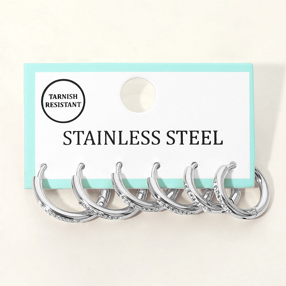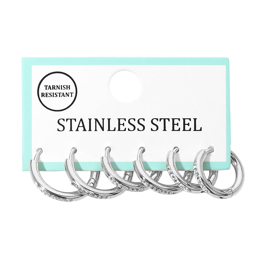 3Pairs - Stainless Steel Stone Pave Huggie Hoop Earring Set
