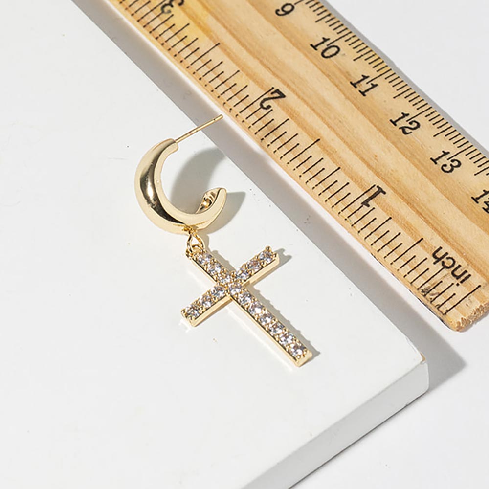 • Elegant cross drop hoop earrings featuring a sleek curved hoop paired with a pavĂ©-style cross charm. Designed for everyday wear or statement styling, this timeless silhouette blends modern edge with classic symbolism, making it a strong choice for trend-focused boutiques and gift-ready jewelry collections.