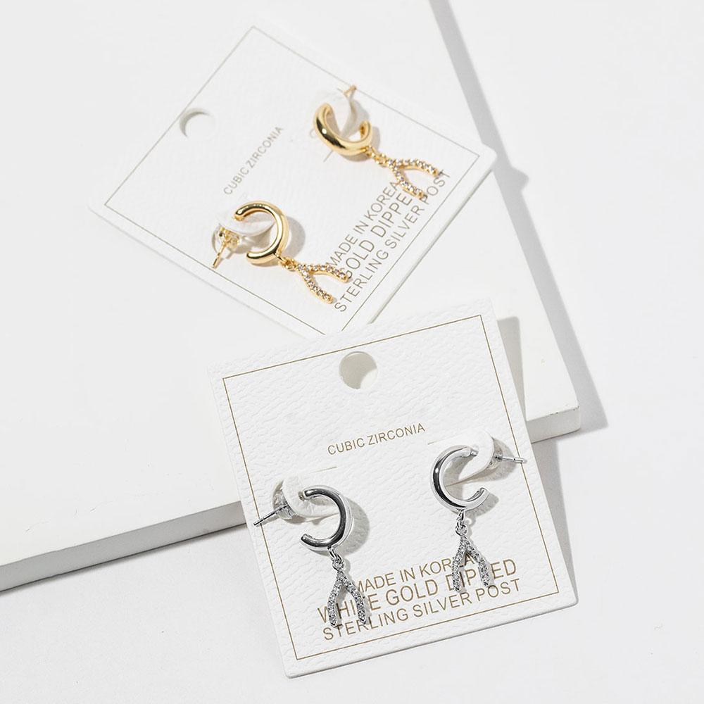 • Modern crescent hoop drop earrings featuring a sleek curved hoop paired with a sparkling CZ-style wishbone accent. Designed for everyday wear or elevated styling, these earrings offer subtle shine, graceful movement, and a versatile silhouette ideal for boutiques and curated accessory collections.