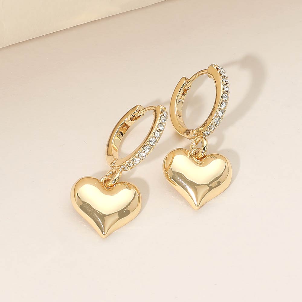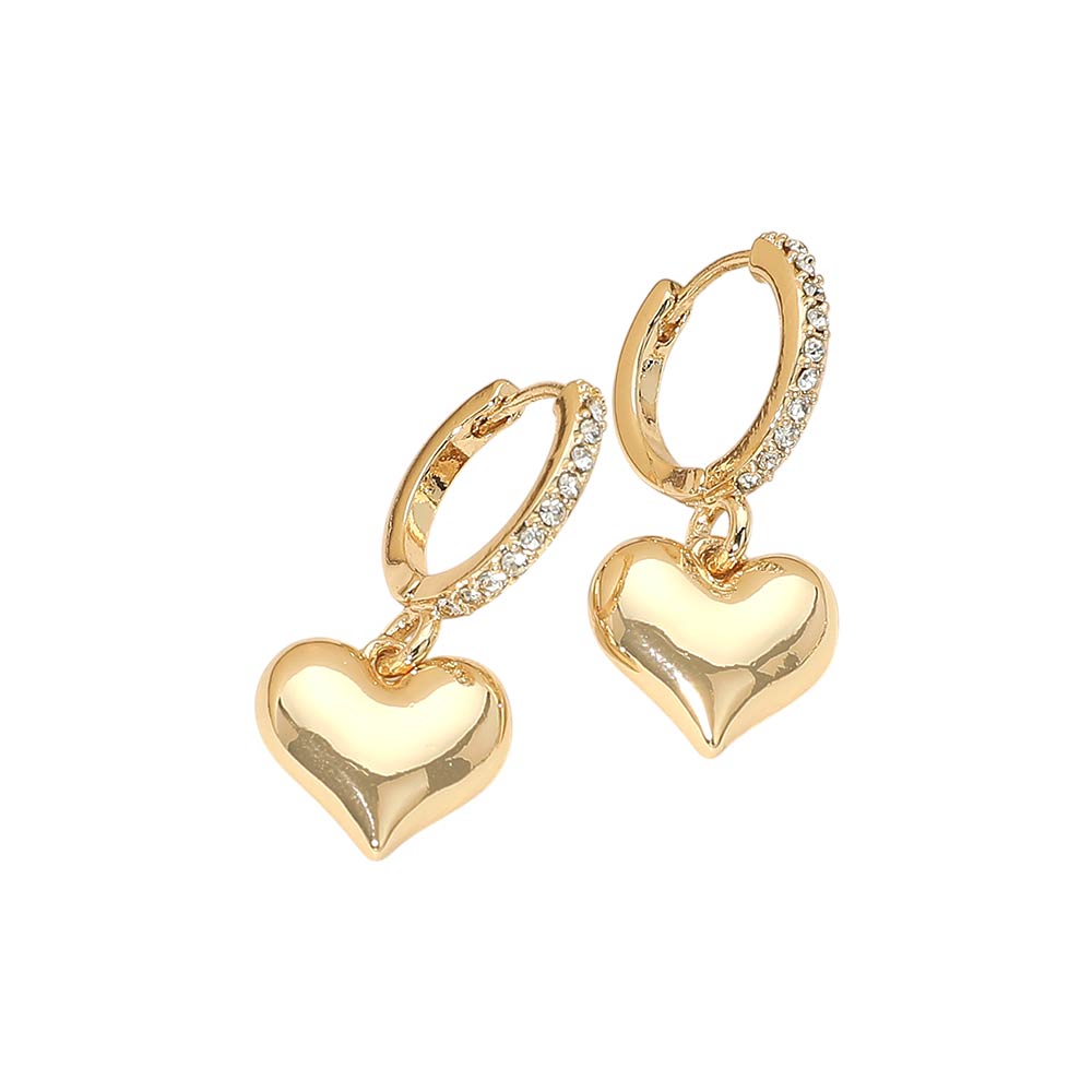 Gold Dipped Heart Charm Drop Dangle Stone Pave Huggie Hoop Earrings