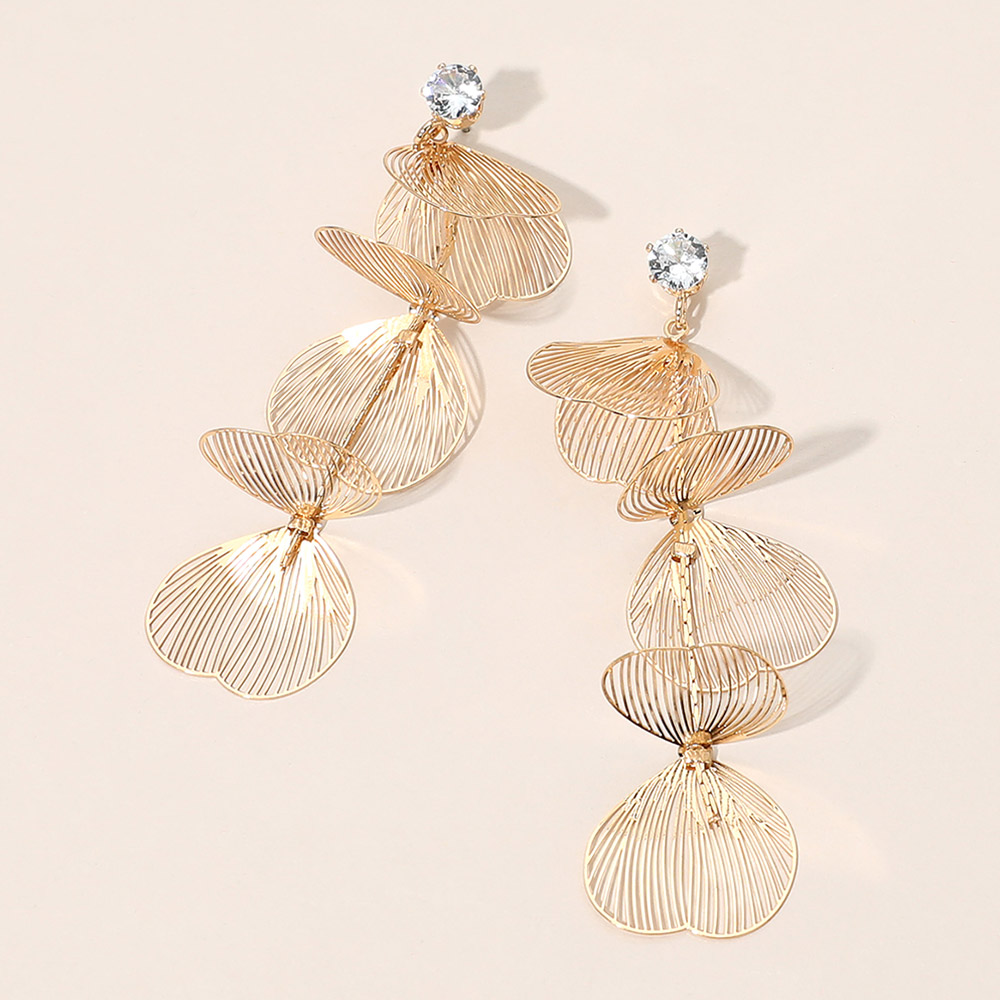 Details • Size : 0.8" X 2.75" • Post Back • Elegant multi layer drop statement earrings featuring a cascading sculpted design with airy openwork shapes and a refined crystal accent. Designed to create movement and dimension, these earrings elevate everyday outfits and special occasion looks with a bold yet graceful silhouette. Ideal for customers seeking modern statement drop earrings with a lightweight feel and eye-catching detail. • Lead and Nickel Compliant