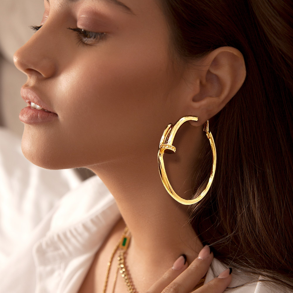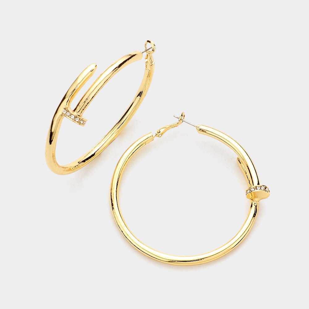 Rhinestone Embellished 2.5 Inch Metal Nail Hoop Earrings