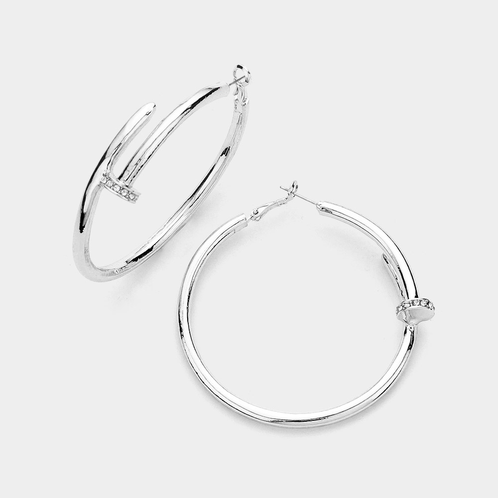 Rhinestone Embellished 2.5 Inch Metal Nail Hoop Earrings