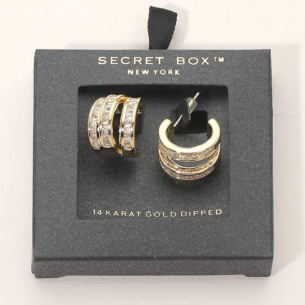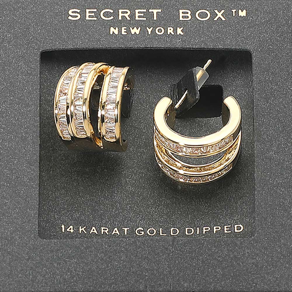 Details • Size : 0.6" X 0.6" X 0.4" • Post Back • Bold triple-row hoop earrings featuring stacked bands with shimmering baguette accents that create a refined layered look. A chic statement accessory ideal for elevating casual or dressy outfits, offering a polished touch for daily wear or events. • Gold Dipped