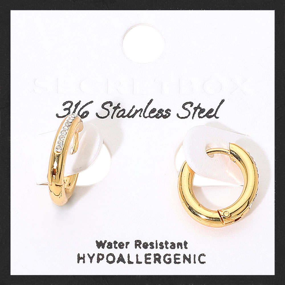 Details • Size : 0.7" X 0.7" • Huggie Back • A refined pair of small hoop earrings featuring a smooth polished design accented with a row of subtle stones for added shine. Water-resistant and hypoallergenic, they offer comfortable daily wear and timeless style, perfect for both casual looks and elevated outfits. • Water Resistant • Hypoallergenic • Stainless Steel