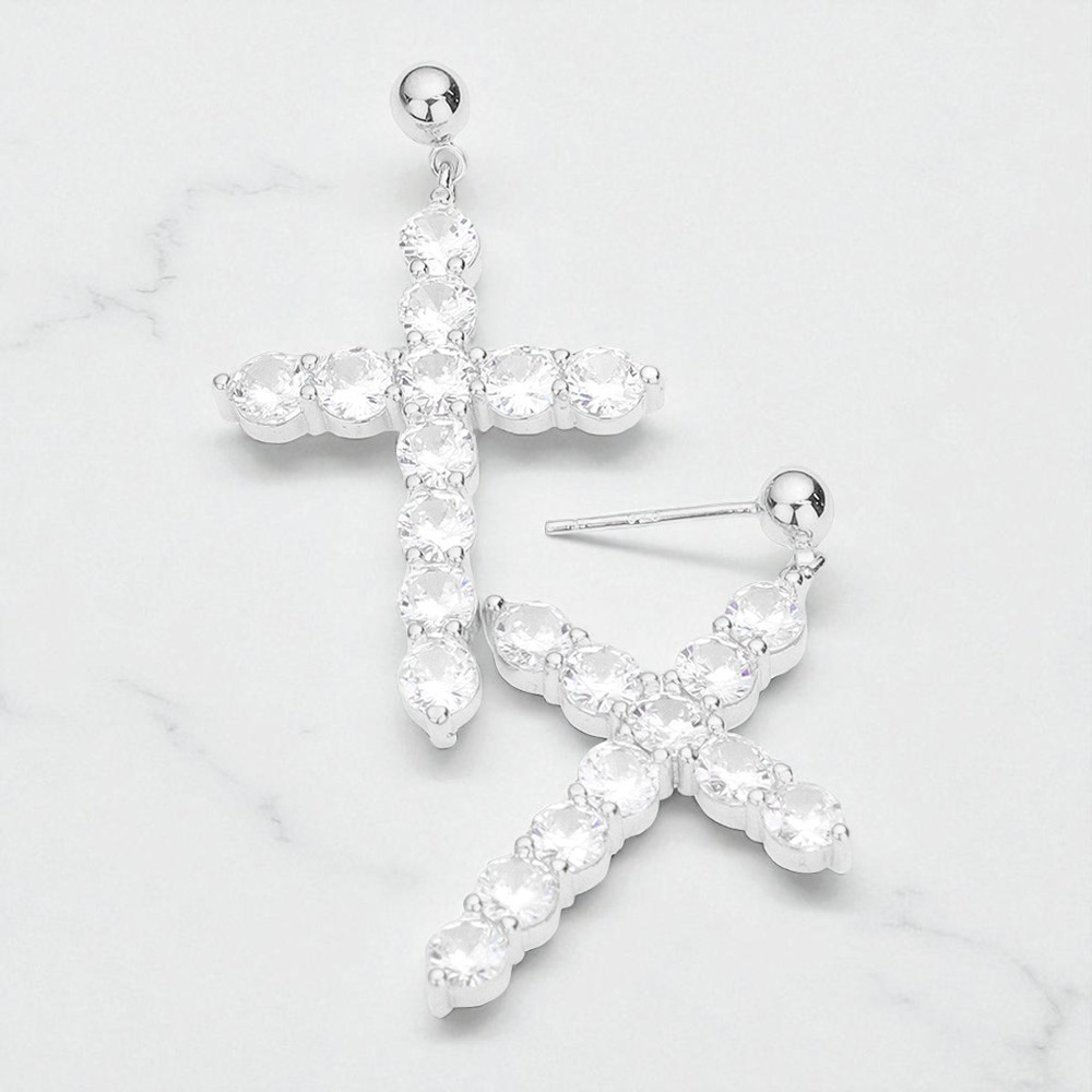 White Gold Dipped CZ Embellished Cross Dangle Earrings