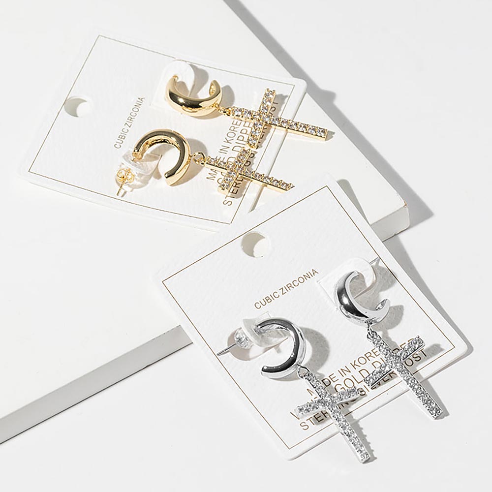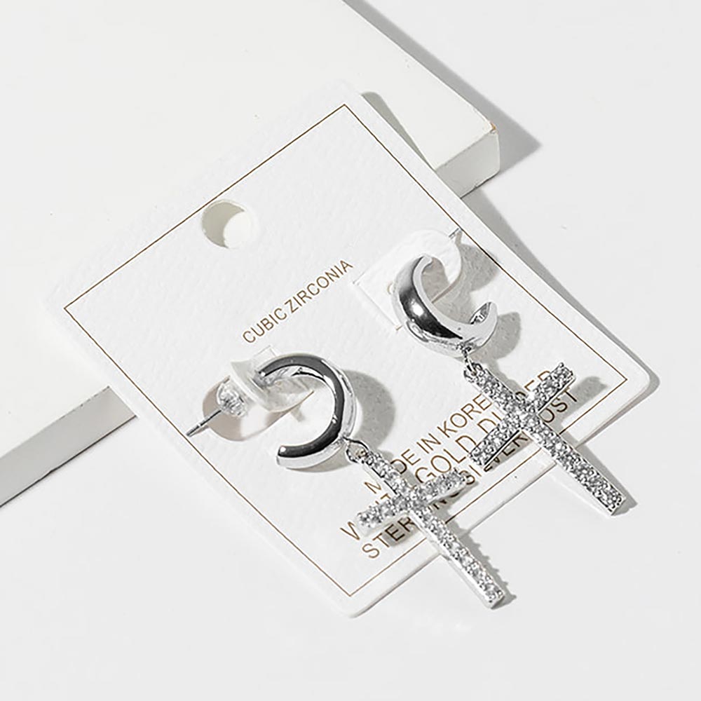 • Elegant cross drop hoop earrings featuring a sleek curved hoop paired with a pavĂ©-style cross charm. Designed for everyday wear or statement styling, this timeless silhouette blends modern edge with classic symbolism, making it a strong choice for trend-focused boutiques and gift-ready jewelry collections.