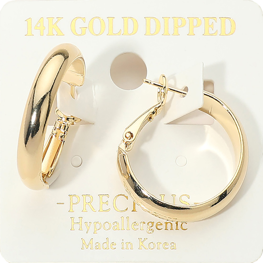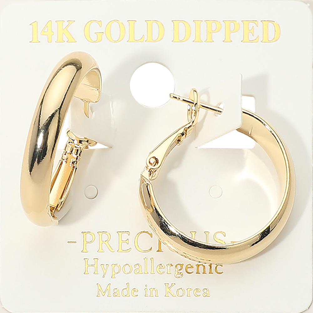 Details • Size : 0.9" X 0.9 • Omega Back • These classic medium hoop earrings feature a smooth rounded profile with a secure latch closure for easy wear and reliable hold. Designed for everyday styling or special occasions, they pair effortlessly with casual or dress looks while offering comfort, durability, and timeless appeal. • Gold Dipped • Hypoallergenic • Made In Korea