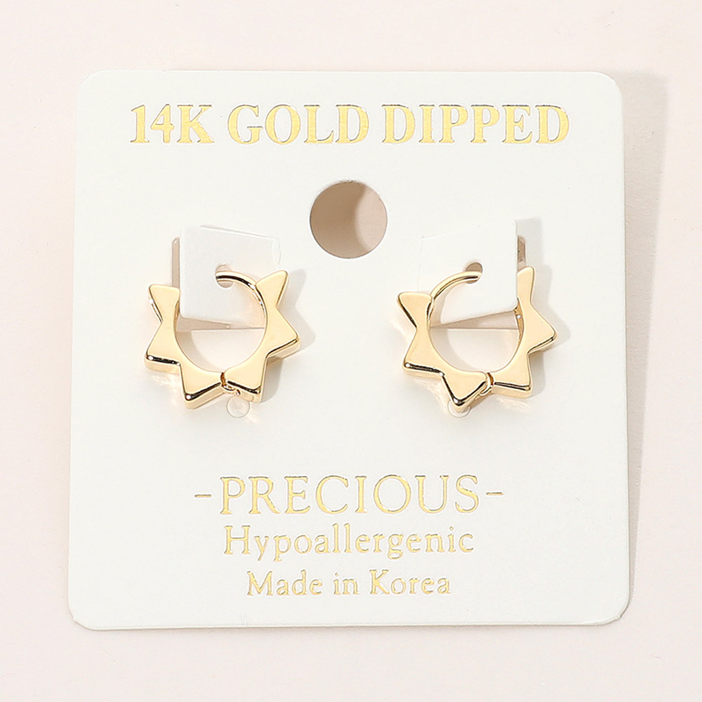 Details • Size : 0.6" X 0.6" • Huggie Back • Add playful charm to your everyday style with these spike hoop earrings featuring a sleek open-star silhouette for a modern twist on a classic shape. Lightweight and comfortable for all-day wear, they pair effortlessly with casual outfits or layered looks and make a fun, thoughtful accessory gift. • Gold Dipped • Hypoallergenic • Made In Korea