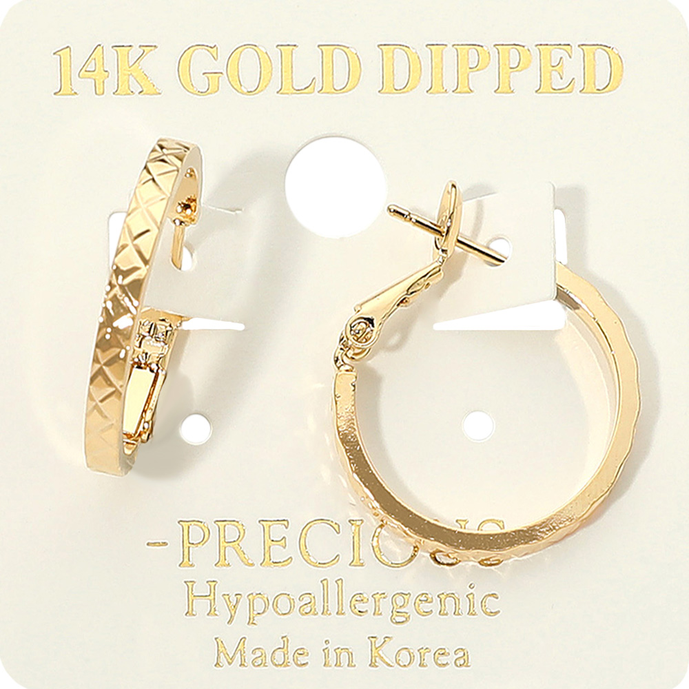 Details • Size : 0.8" X 0.9" • Post Back • Add a touch of refined charm to any outfit with these textured hoop earrings featuring a timeless design and secure clasp closure. Lightweight and comfortable for all-day wear, they effortlessly complement casual and elegant looks with understated sophistication. • Gold Dipped • Hypoallergenic • Made In Korea