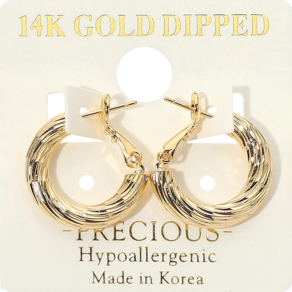 Details • Size : 0.8" X 0.75" • Omega Back • Elevate your look with these textured round hoop earrings designed for a refined yet versatile appeal. Their polished, ribbed finish adds dimension and sophistication, while the secure clasp ensures comfort for everyday wear or special occasions. • Gold Dipped • Hypoallergenic • Made In Korea